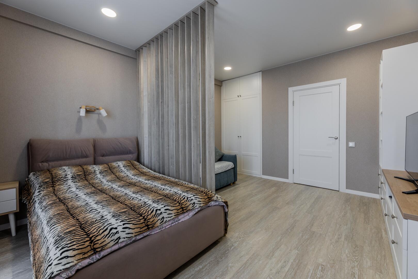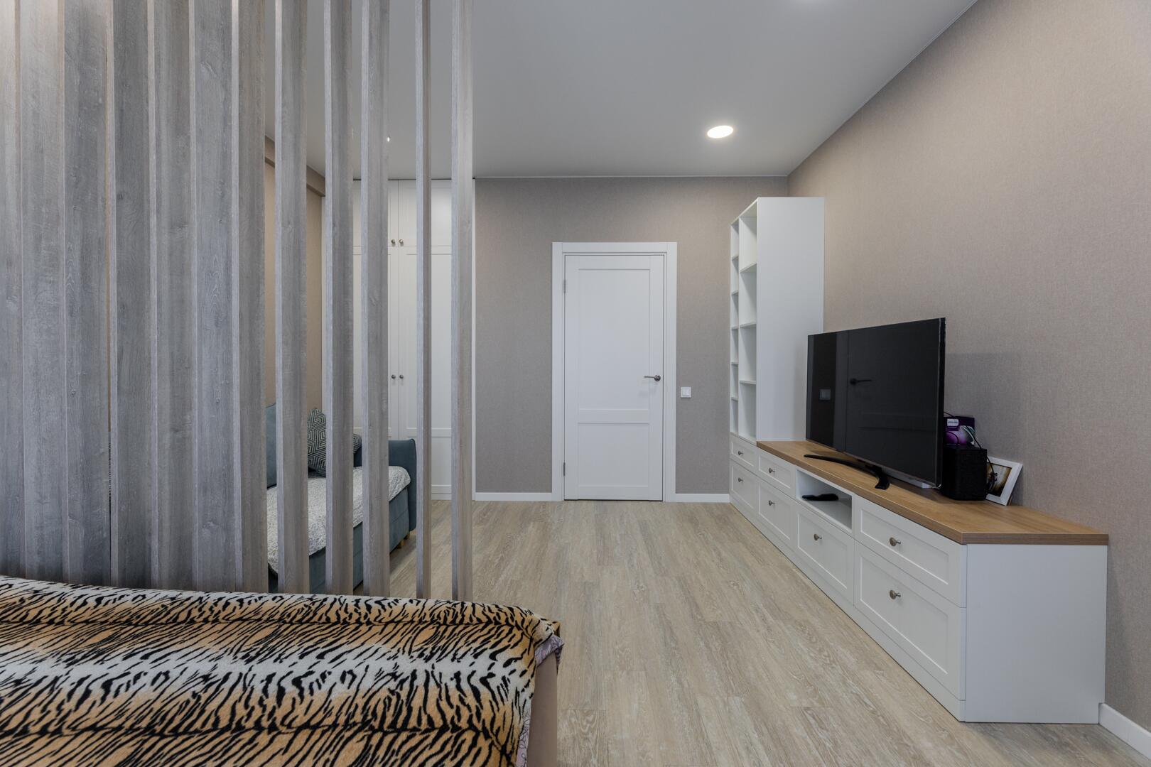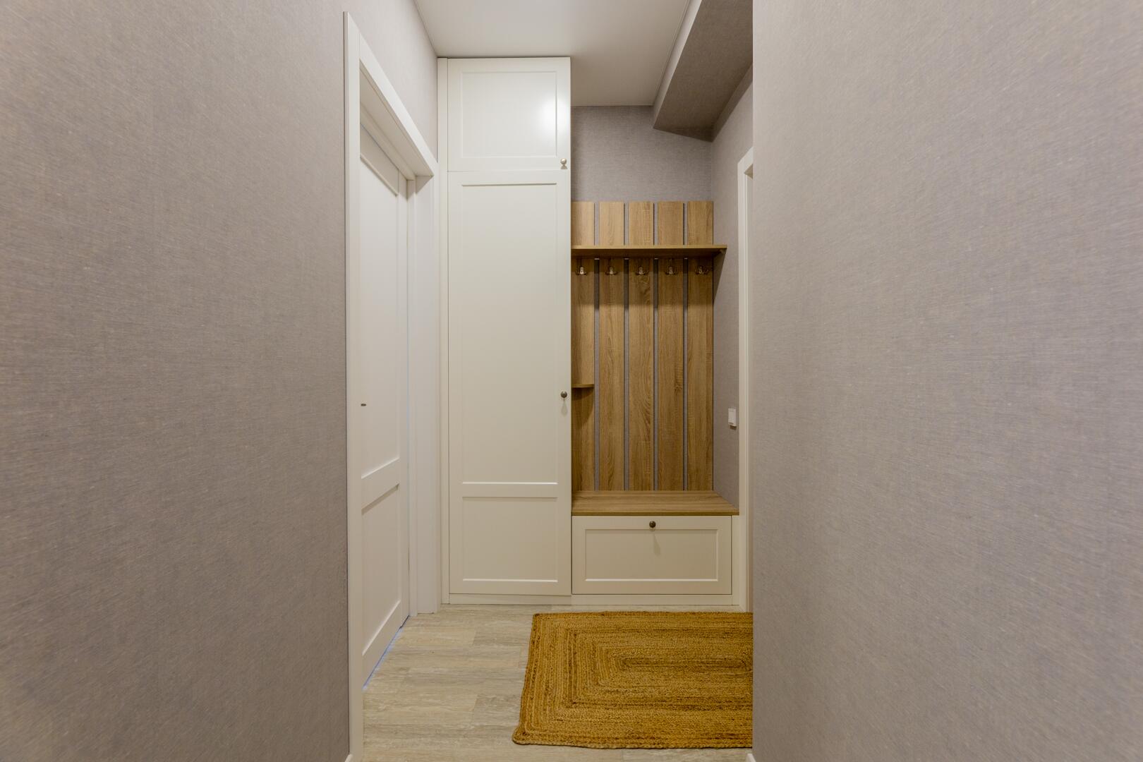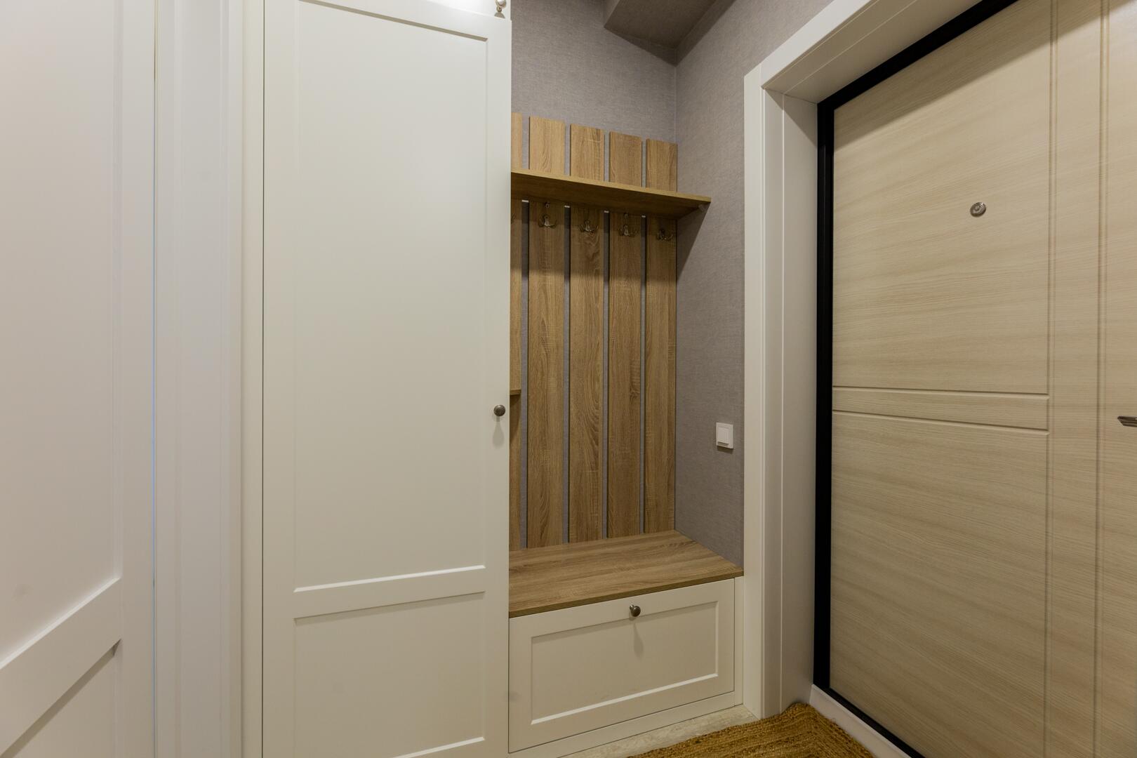 Новая, укрепленная входная дверь. Межкомнатные двери - экоэмаль. Шкафы в комнате и прихожей изготовлены из ЛДСП EGGER. Напольное покрытие - кварц-винил. Потолки натяжные. Комната оклеена светлыми обоями (производство Бельгия).