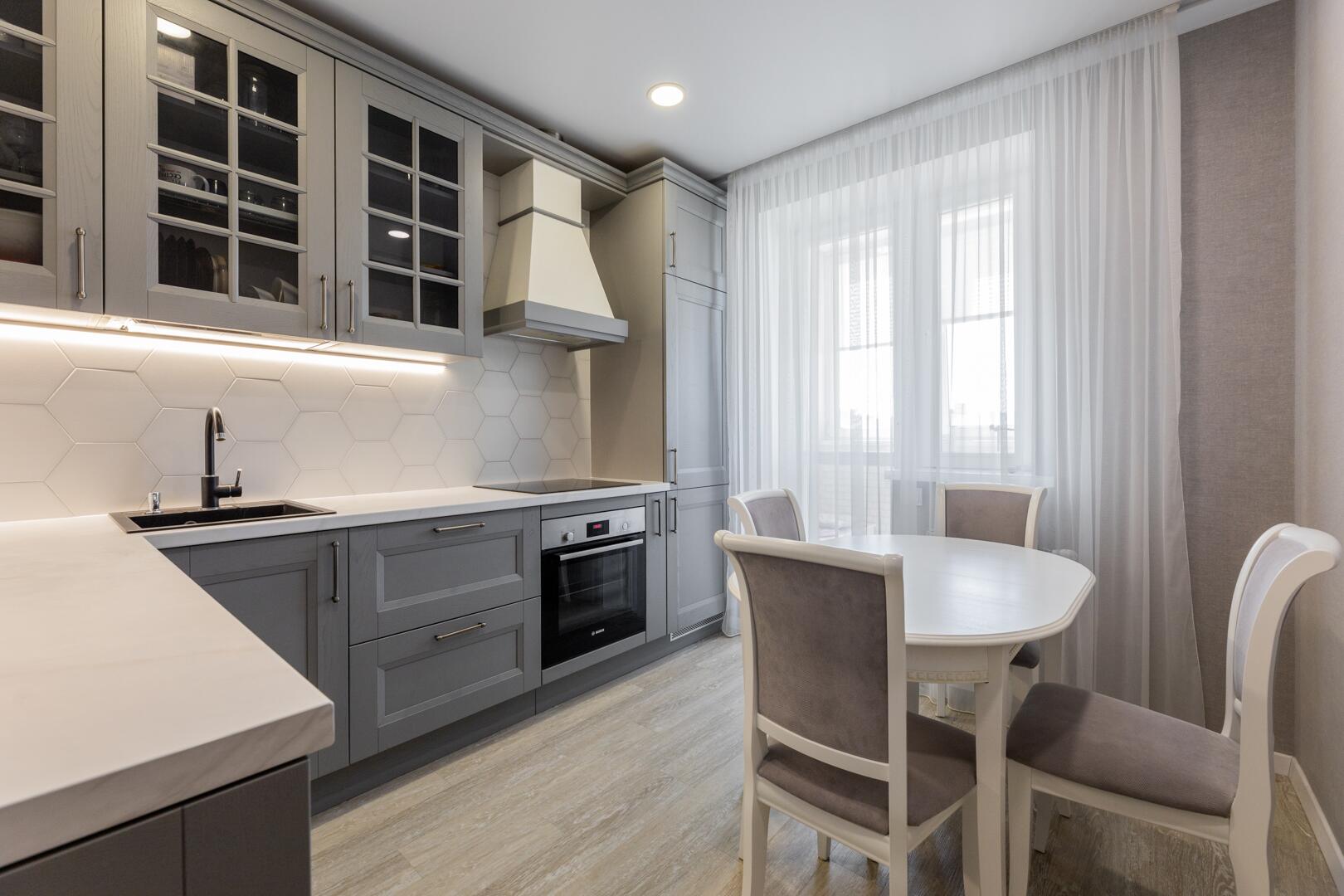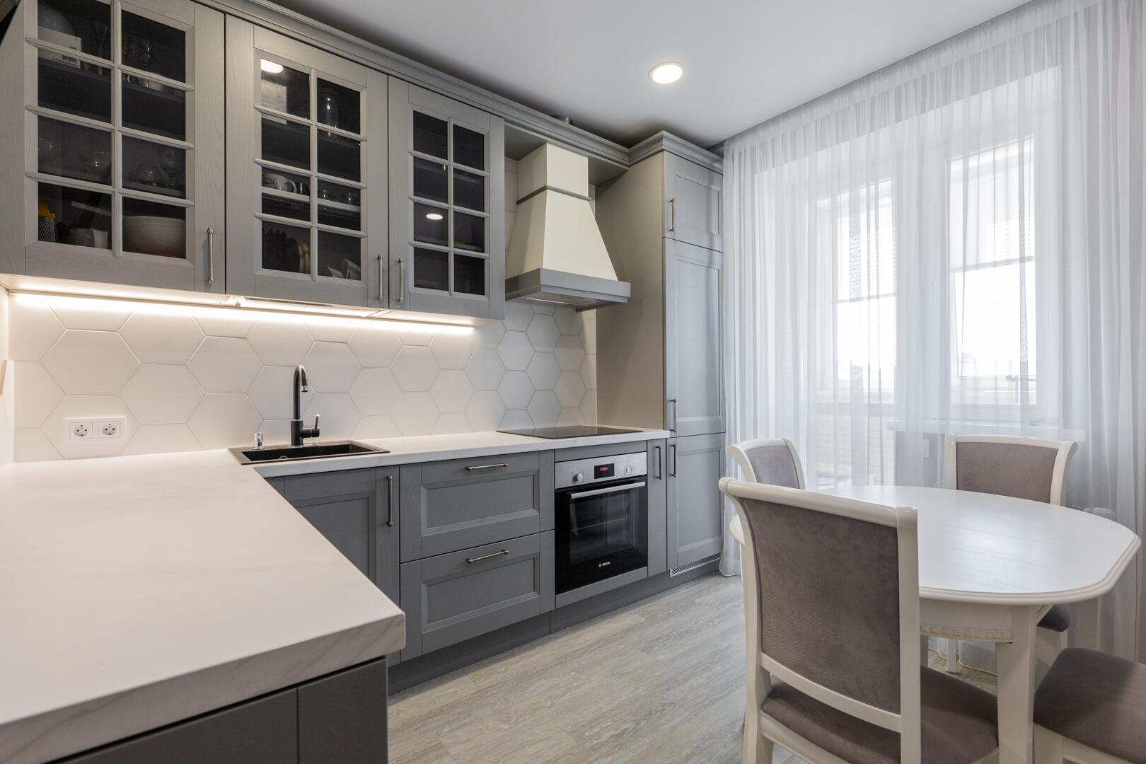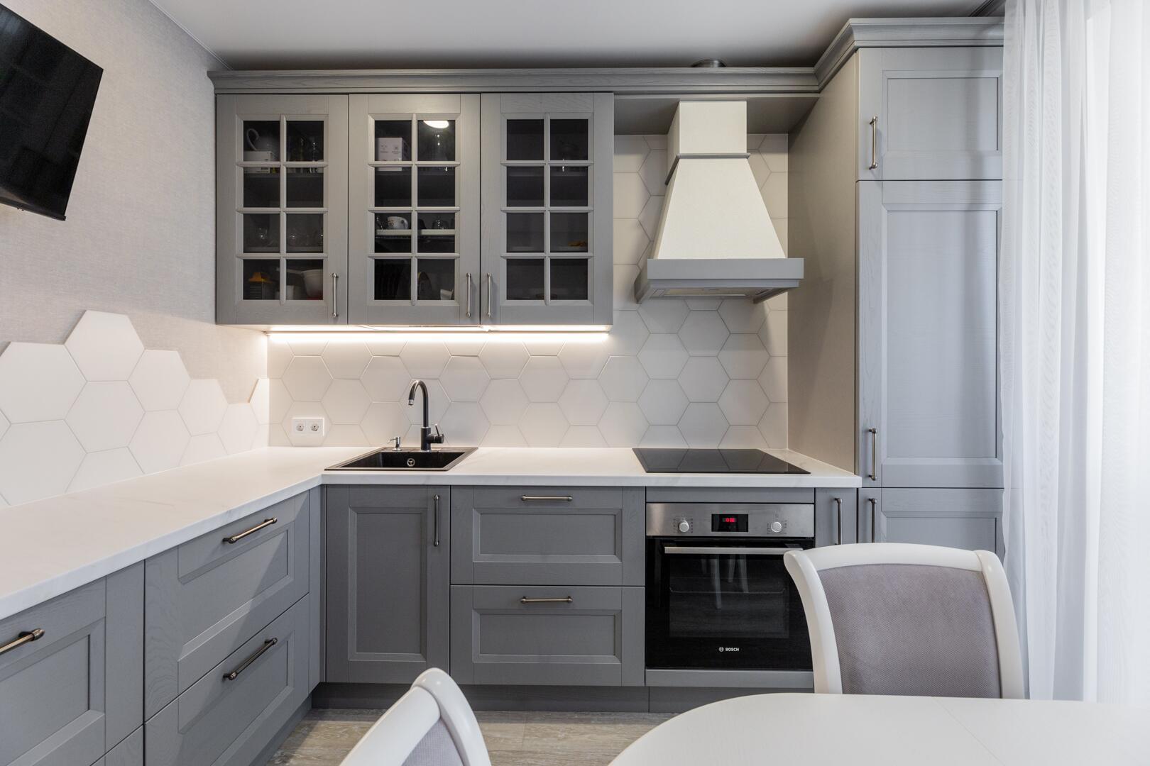 Кухня из ЛДСП c фурнитурой Blum Tandem, варочная панель и духовой шкаф - Bosch.Встроенный холодильник Samsung. Кухонный фартук выложен плиткой формы шестигранник, производство Польши. Мойка из кварцевого песка, смеситель Grohe. Встроенная вытяжка Elica.