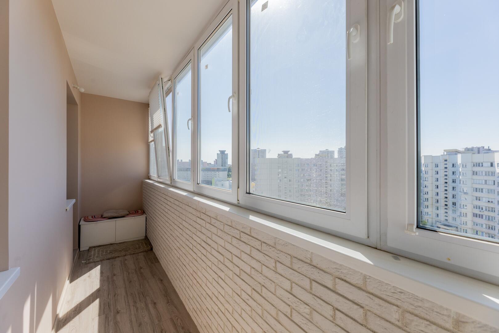 Лоджия утеплена минватой, установлен стеклопакет ПВХ, пол выложен плиткой. Размещен комфортный шкаф для хранения.