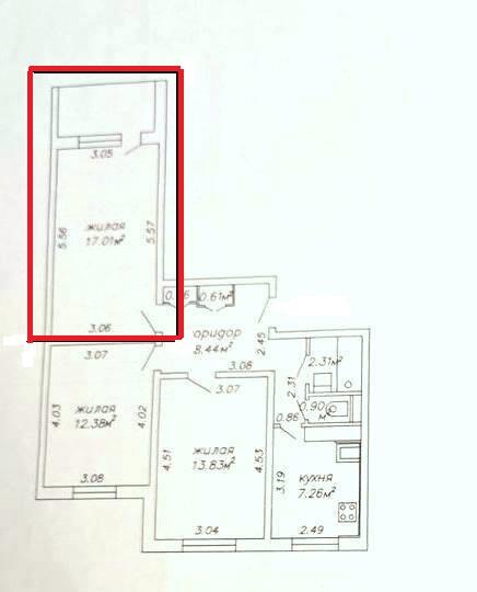 Комната 17,01 м.кв в квартире 65,2( СНБ) м.кв. составляет 41/100 долей в собственности, одна соседка.