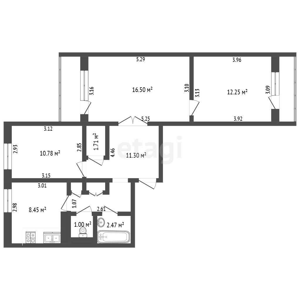 - Три комнаты: 10.18 м2, 12.25 м2 и 16.5 м2.
