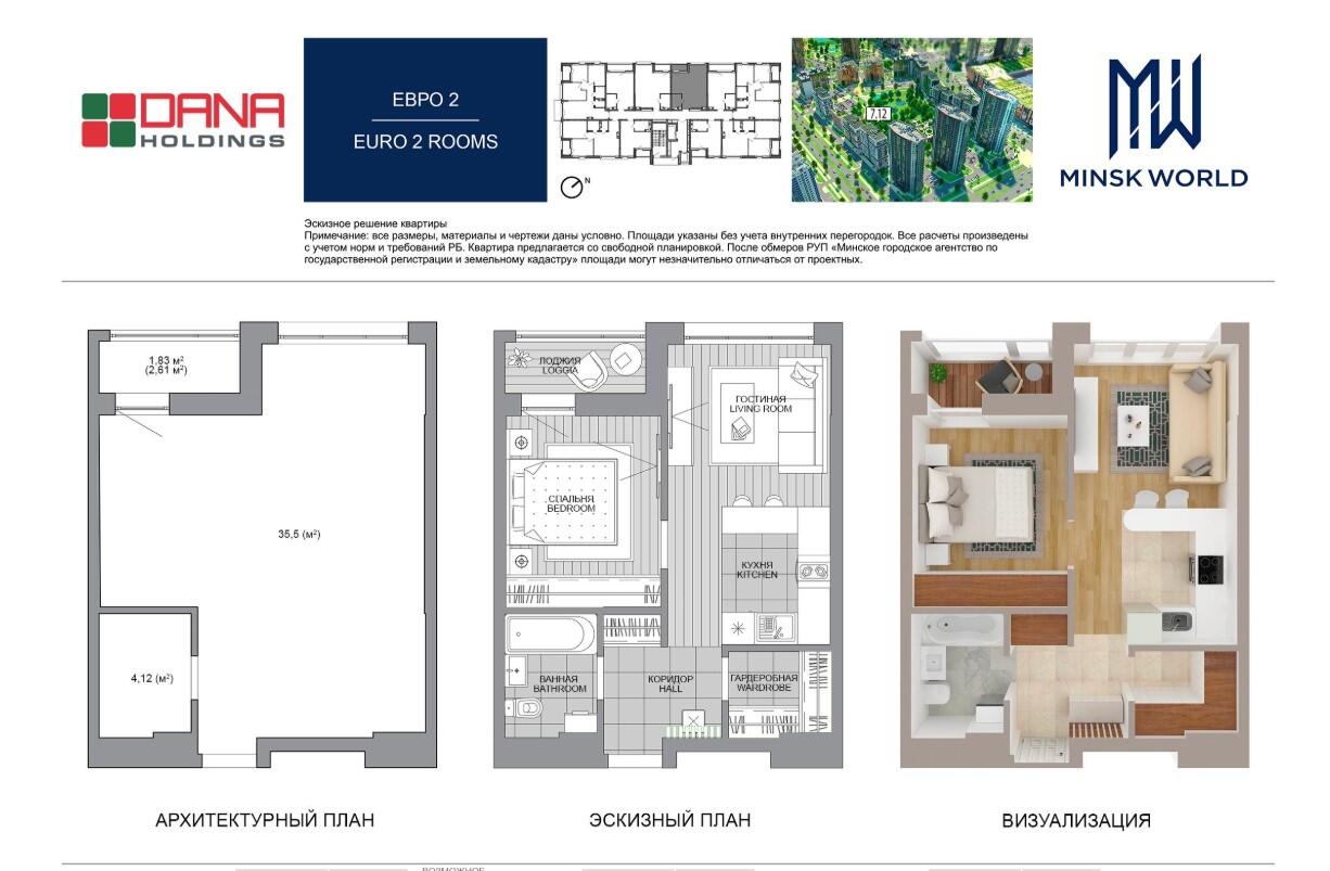 В доме всего 90 квартир. Их площадь от 27 до 70 м2. Все квартиры в комплекс Минск Мир по умолчанию являются однокомнатными. Однако планировка этих помещений свободна. Это большой плюс. Если в самой маленькой квартире площадью 28 м2 можно обустроить уютную студию с кухней, то максимальный метраж — 70 м2 — открывает возможность создать полноценную «трёшку» для комфортного проживания семьи.
