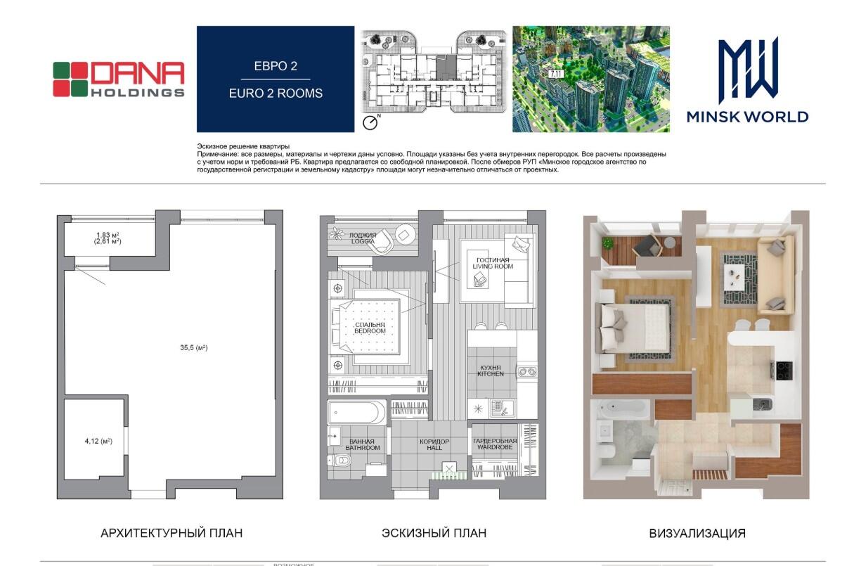 В доме всего 90 квартир. Их площадь от 27 до 70 м2. Все квартиры в комплекс Минск Мир по умолчанию являются однокомнатными. Однако планировка этих помещений свободна. Это большой плюс. Если в самой маленькой квартире площадью 28 м2 можно обустроить уютную студию с кухней, то максимальный метраж — 70 м2 — открывает возможность создать полноценную «трёшку» для комфортного проживания семьи.