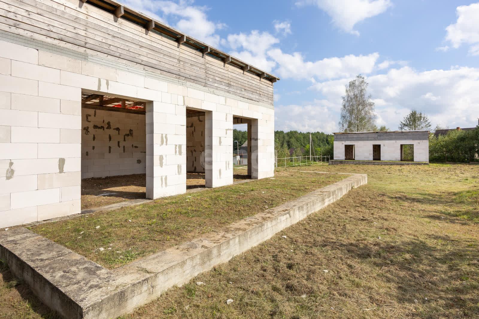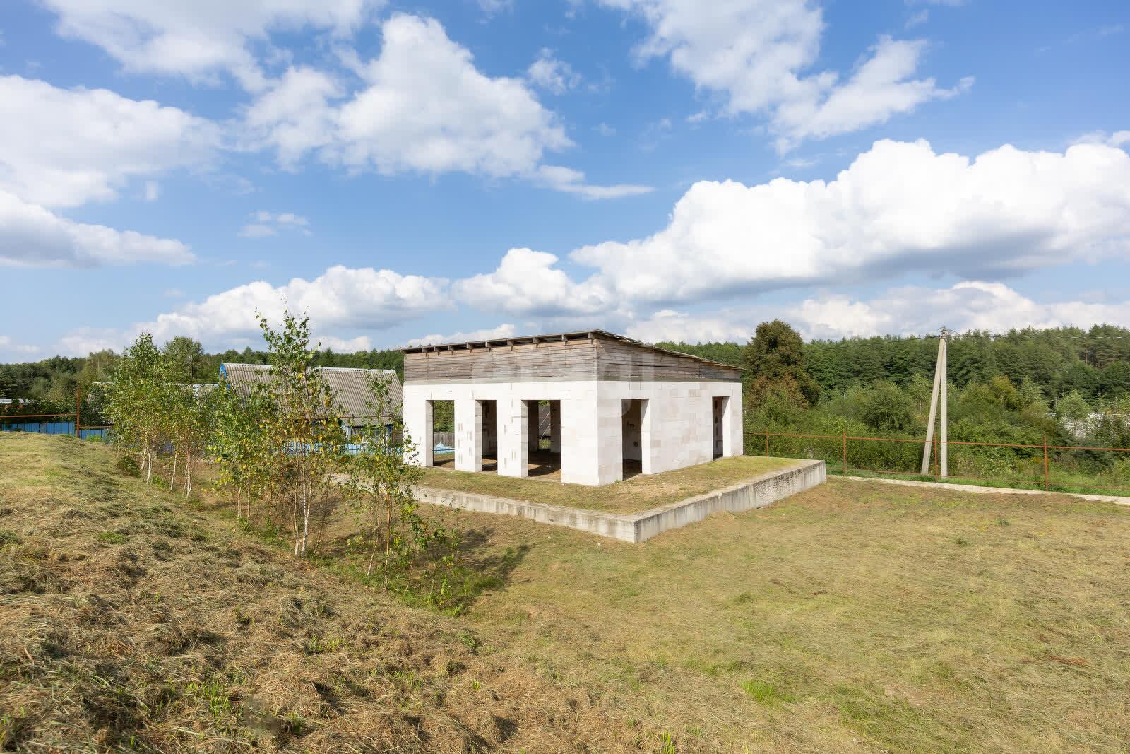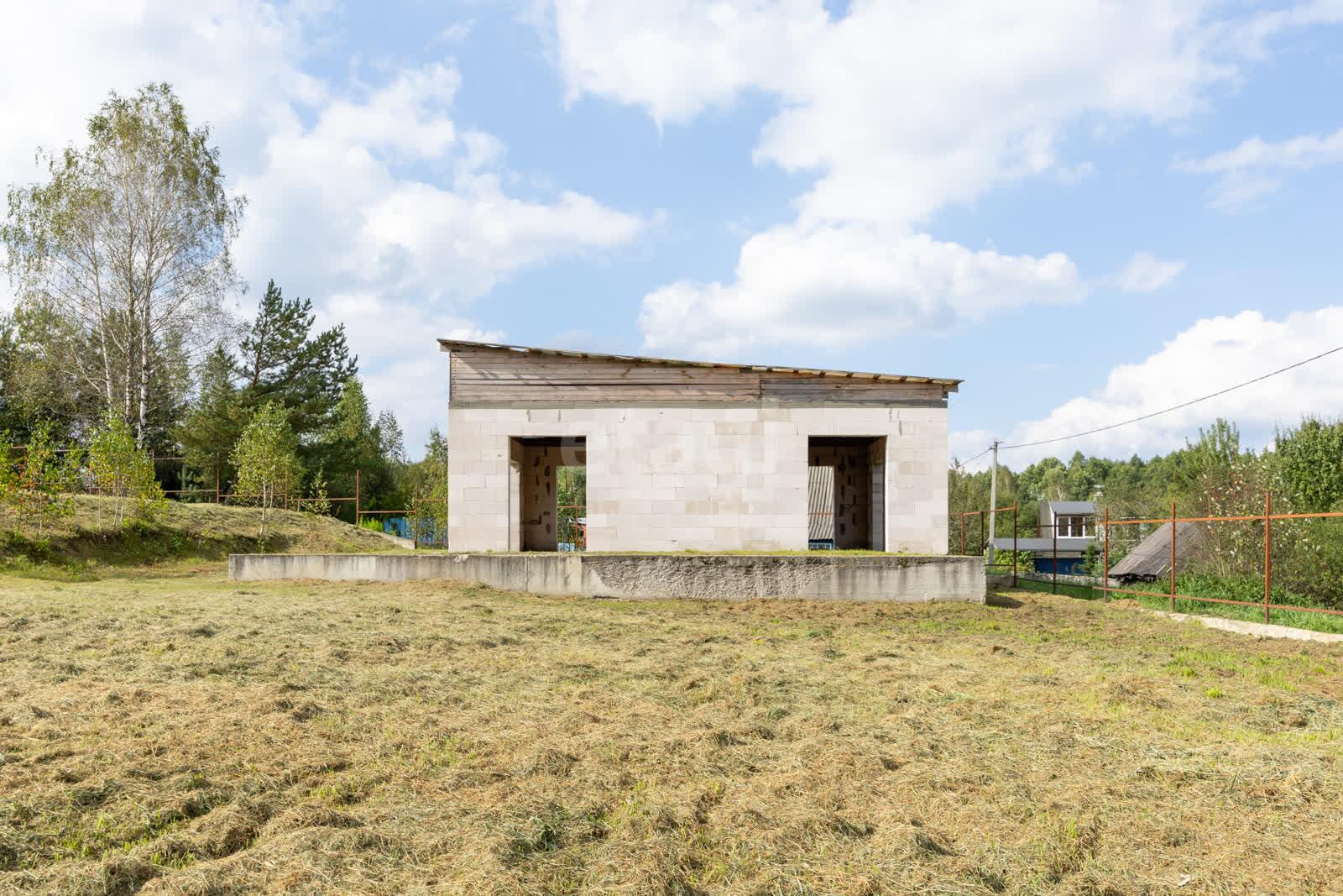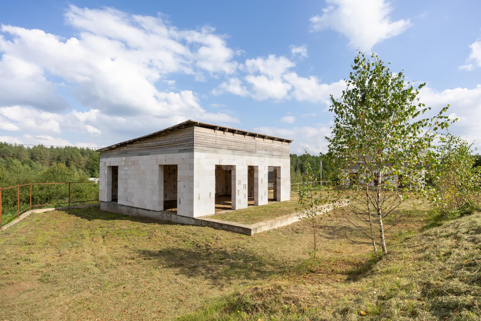 Незавершенное законсервированное капитальное строение около леса и озера