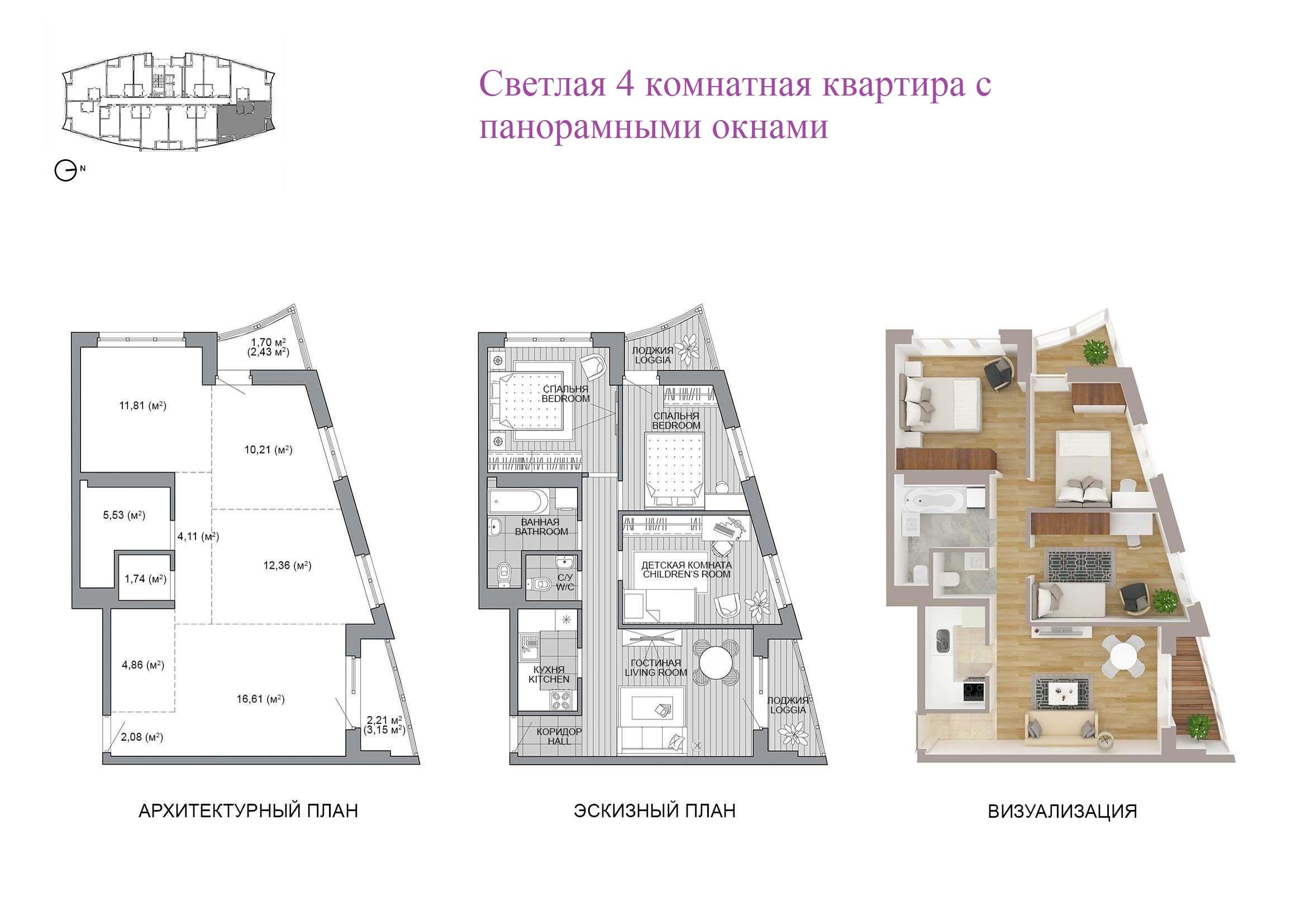 Высота потолков 2,7м.( 3м на последних и первых этажах); • Панорамные окна