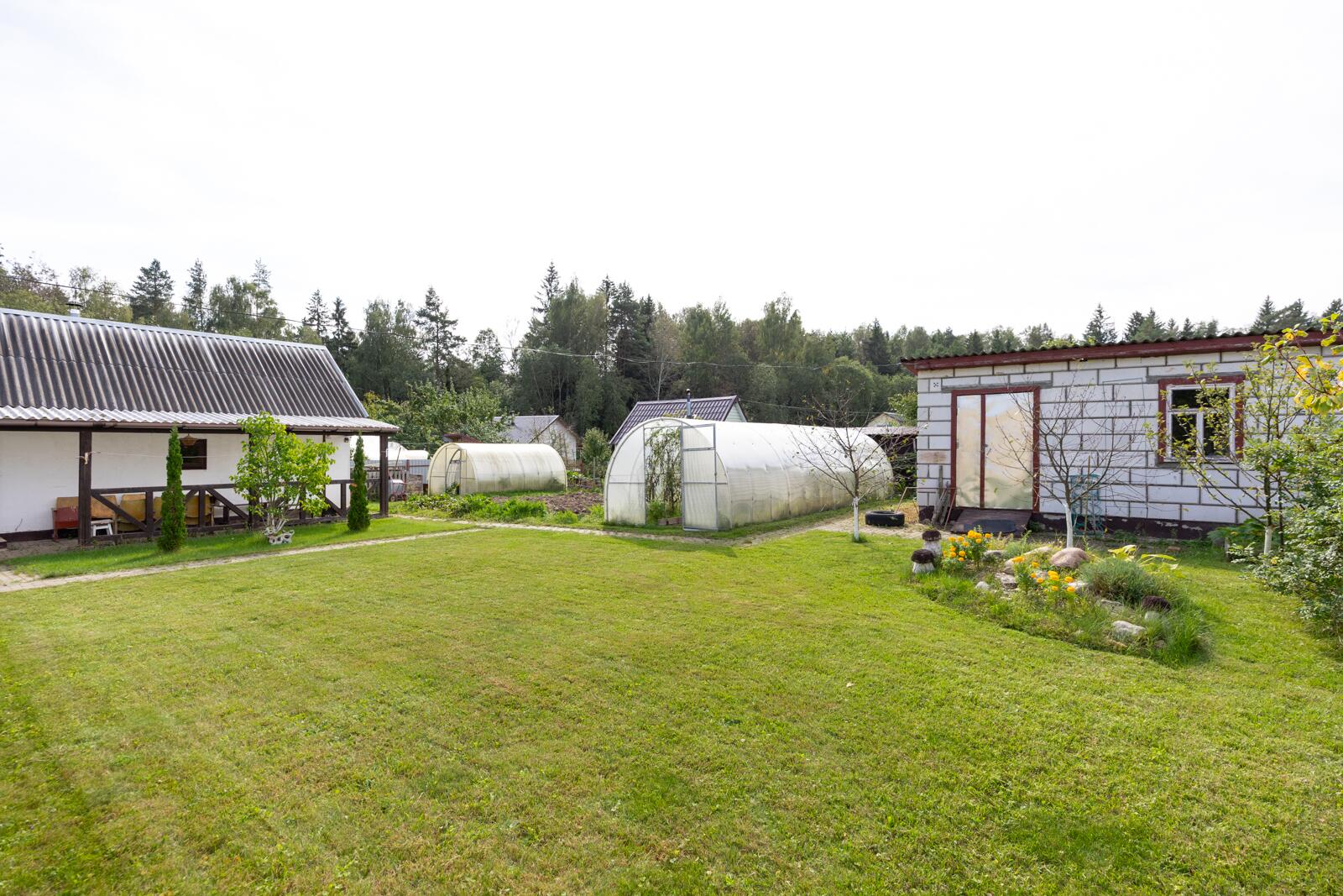 Высажена плодовые деревья, 2 теплицы, облагороженные грядки, газон и ландшафтные композиции