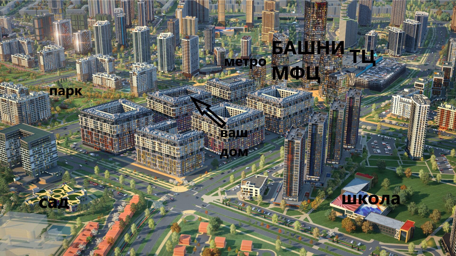 В каждом квартале современные школа или сад с бассейнами и современным оснащением.