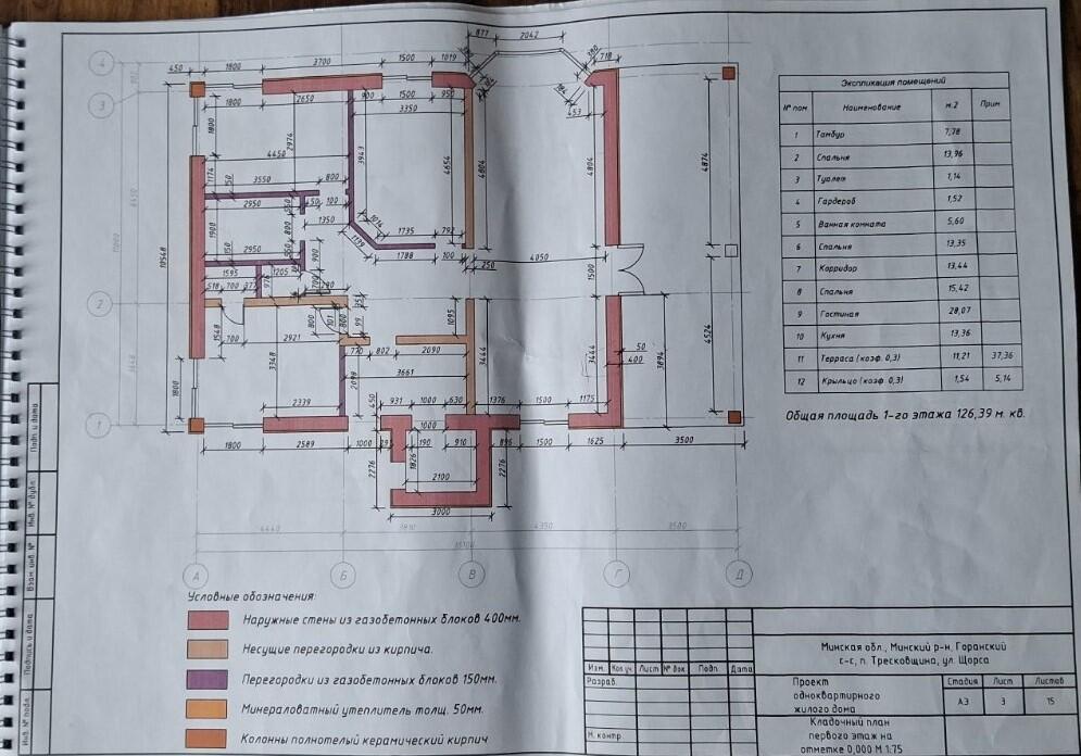 -- 1-й этаж: гостин/кухня 28 м2, раздельный санузел, котельная, спальня 14 м2, спальня 13,35 м2, спальня 15,4 м2