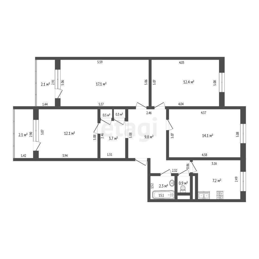 - 4 изолированные комнаты (12.1 / 17.1 / 12.4 / 14.1 м2) - каждому своё пространство;