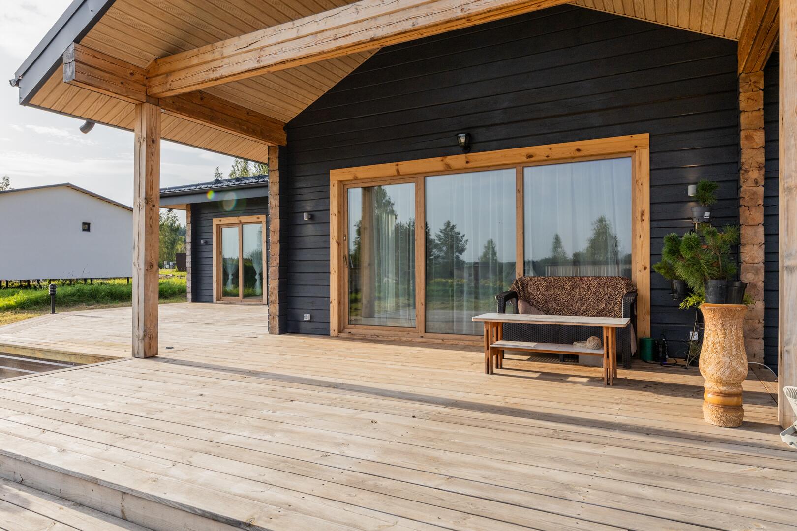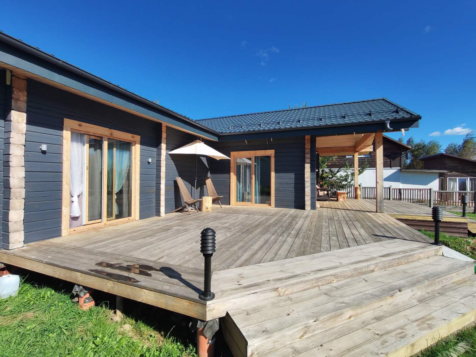 - просторная терраса – 65 м.кв., застекленная окнами ПВХ с раздвижной системой ПАТИО. Входная дверь в дом металлическая с терморазрывом и тройным энергосберегающим стеклопакетом;