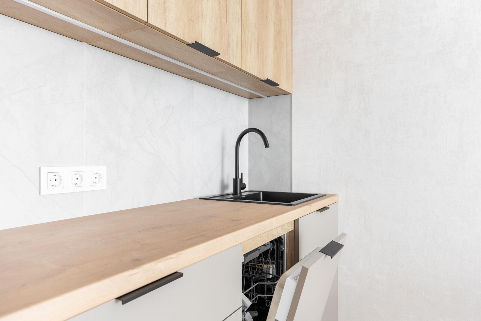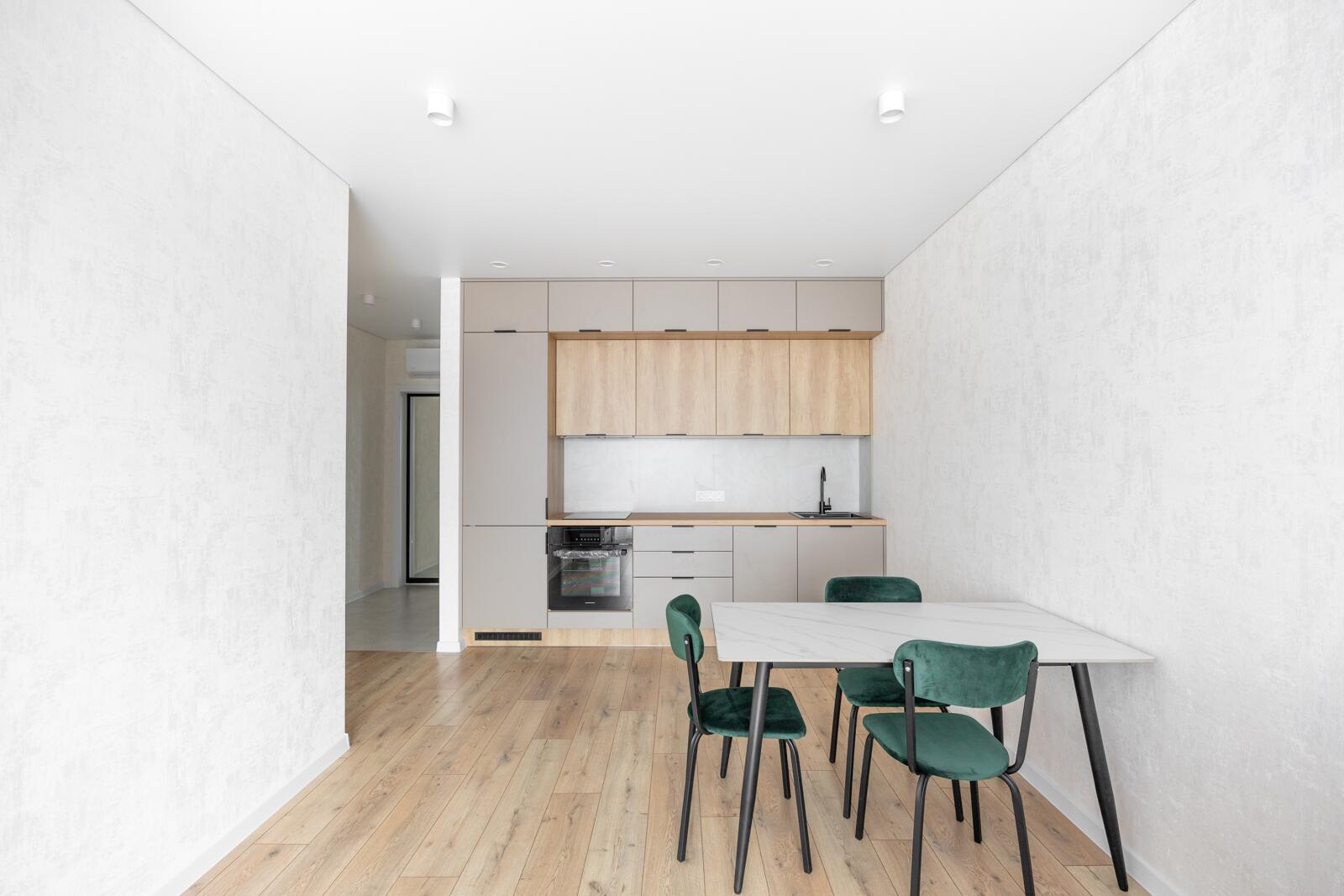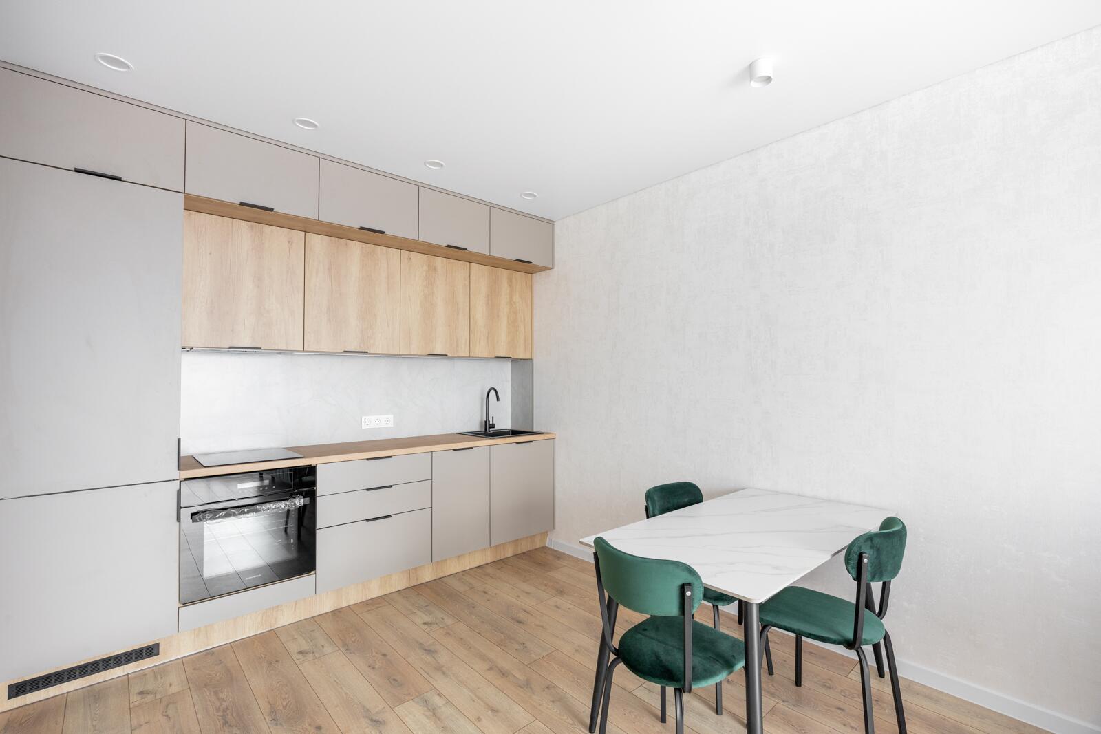 Встроенная кухня с бытовой техникой (варочная панель, посудомойка, встроенный холодильник).