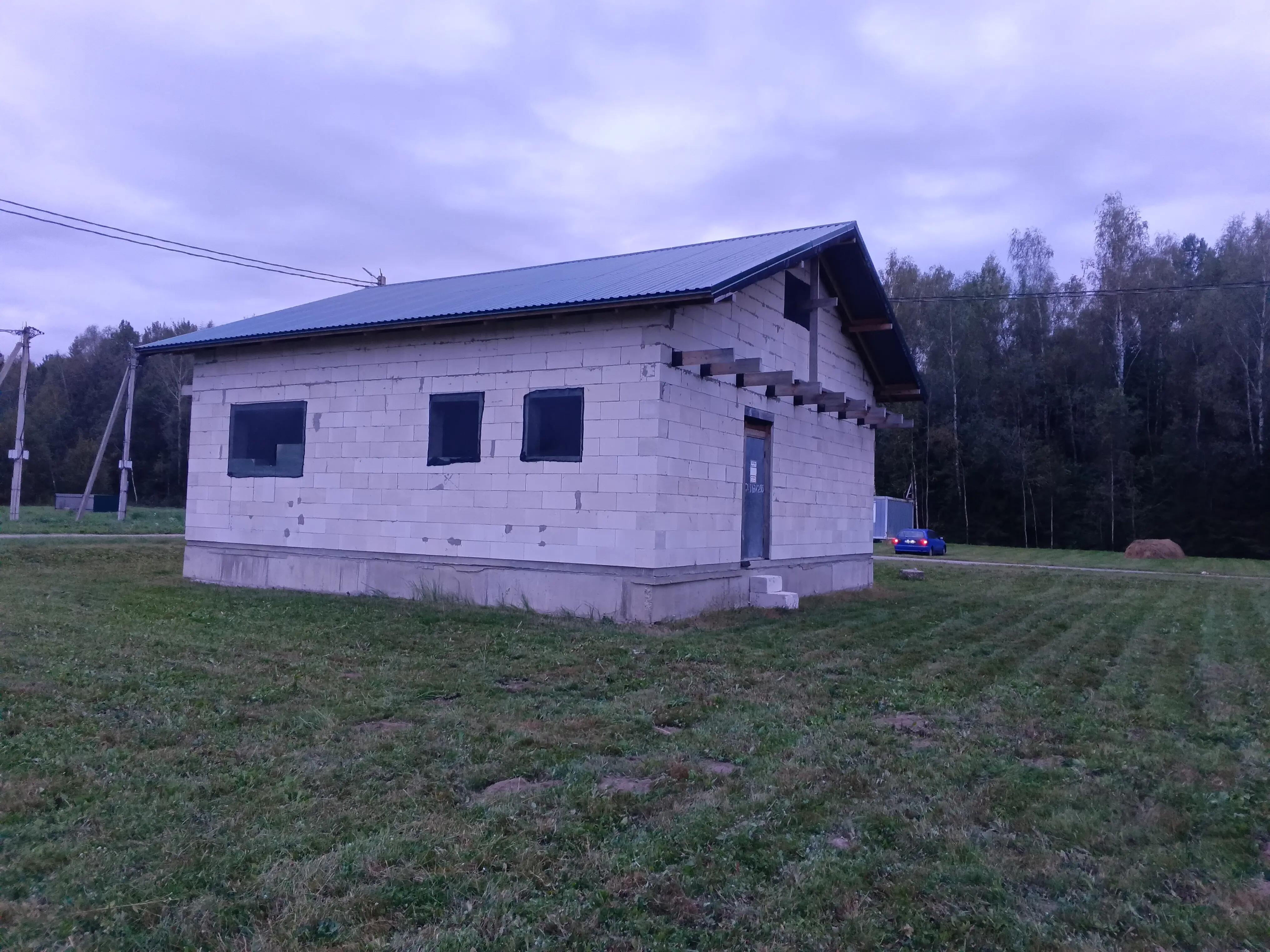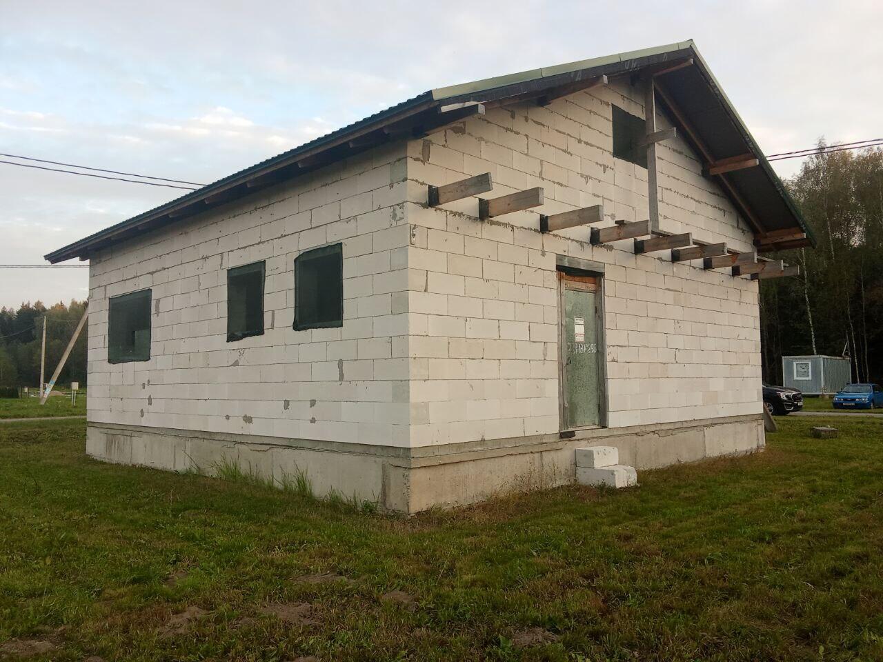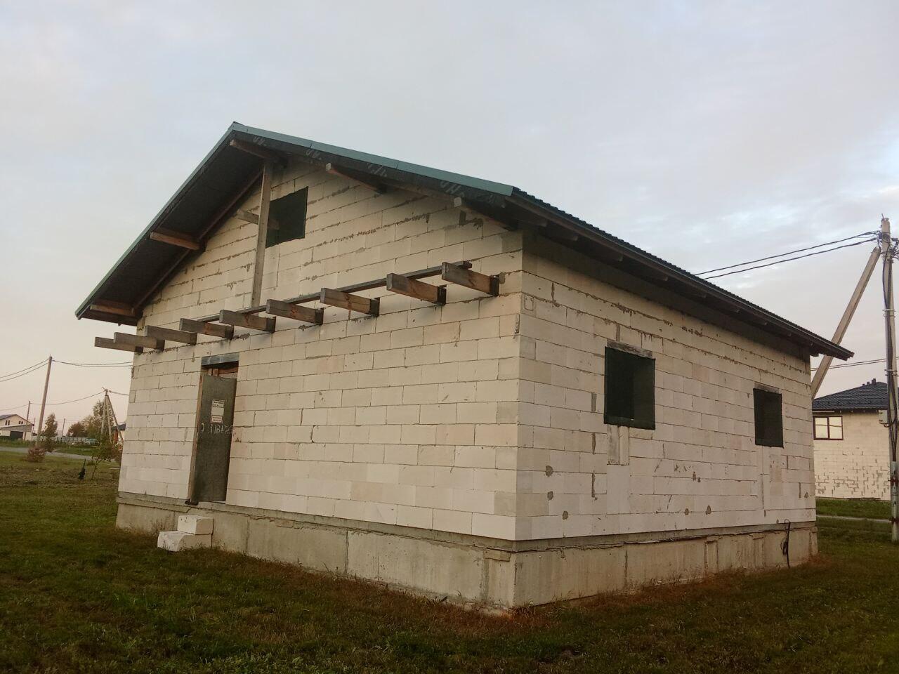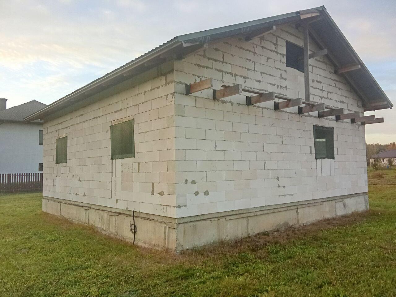 Площадь дома 120 м2 (85 + 35 м2 мансардный этаж), фундамент - ж/б блоки 2.4на0.4на0.6, стены - г/с блока 300мм, балки перекрытия -100*200мм, черновая стяжка - 100 мм. Залито основание под гараж либо иную хозпостройку.