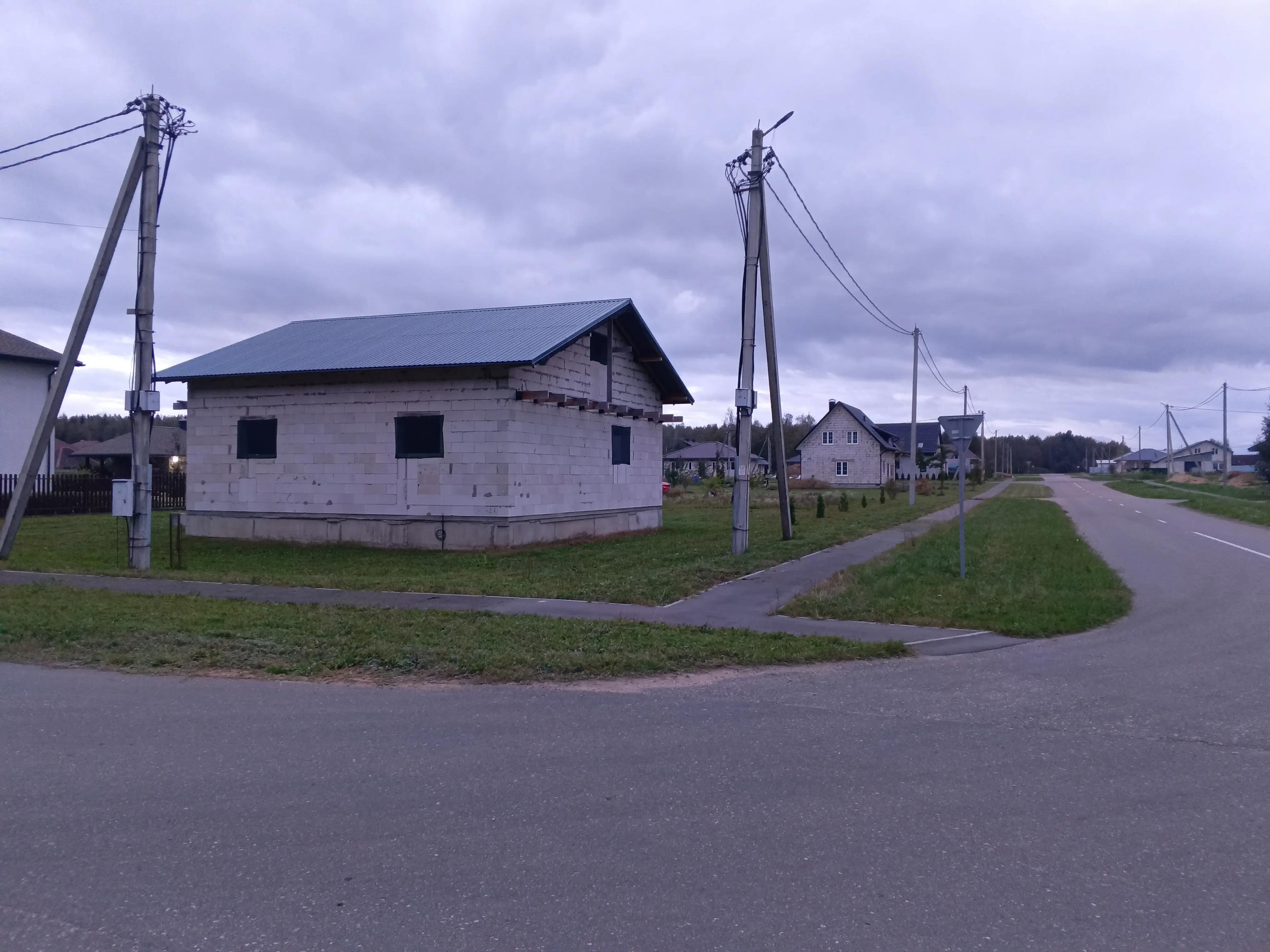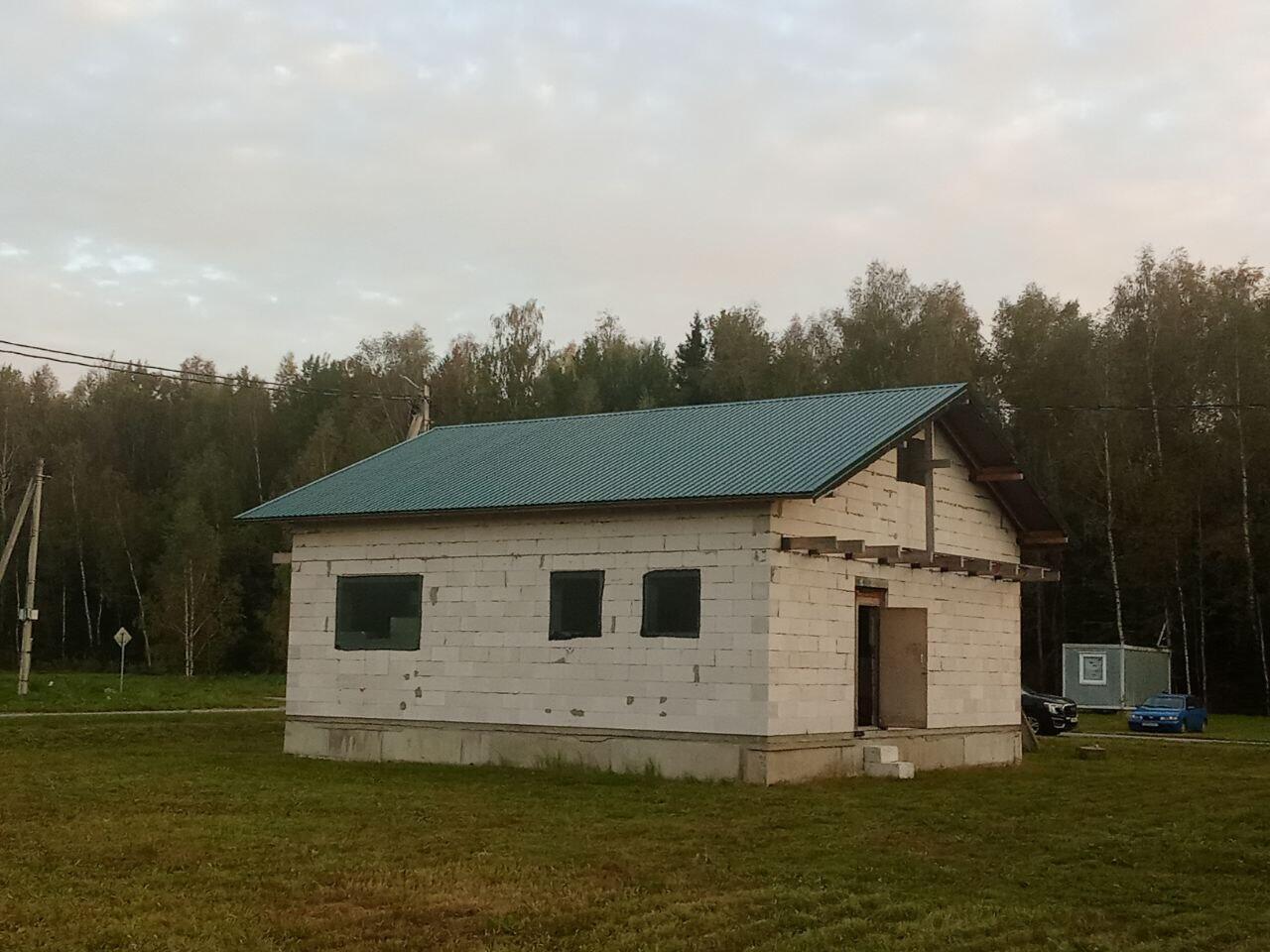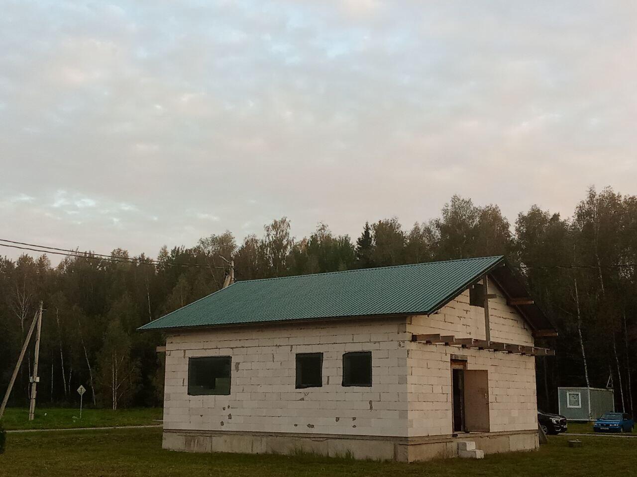 Площадь дома 120 м2 (85 + 35 м2 мансардный этаж), фундамент - ж/б блоки 2.4на0.4на0.6, стены - г/с блока 300мм, балки перекрытия -100*200мм, черновая стяжка - 100 мм. Залито основание под гараж либо иную хозпостройку.