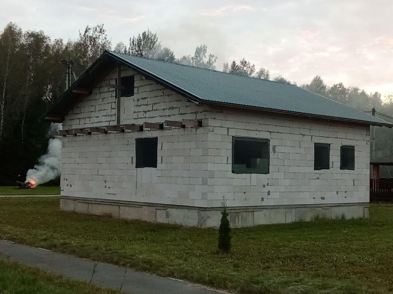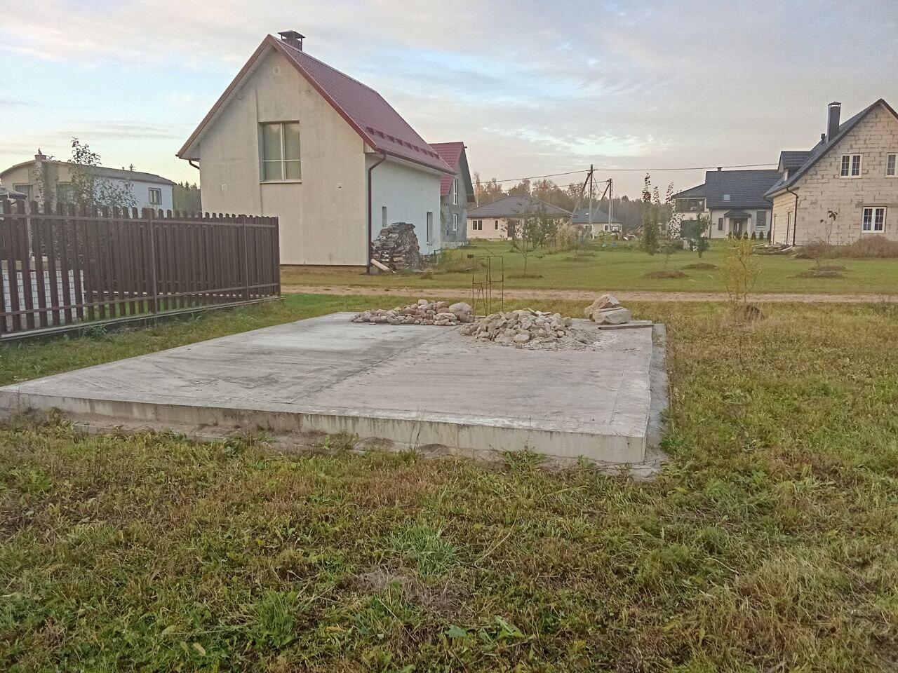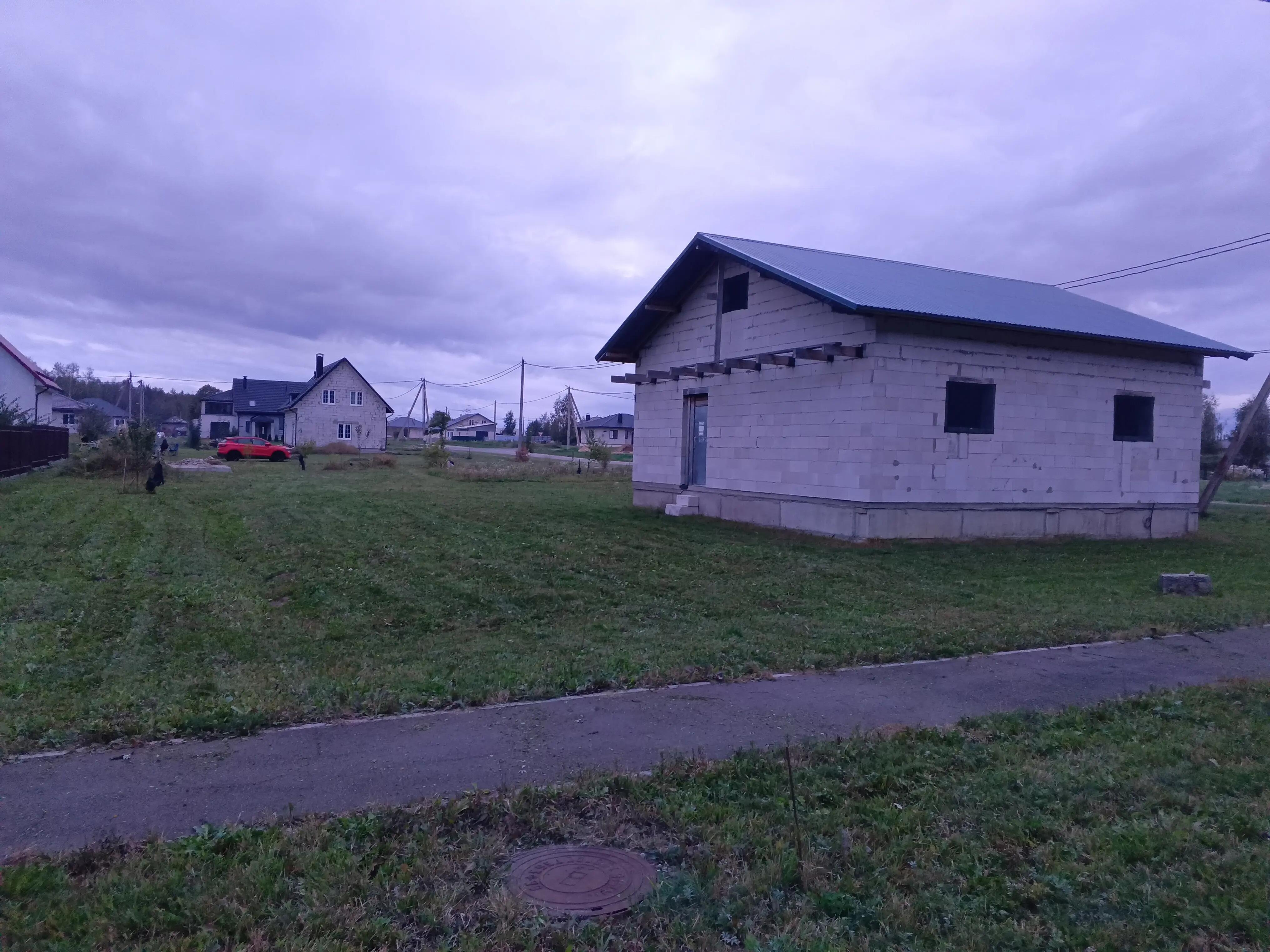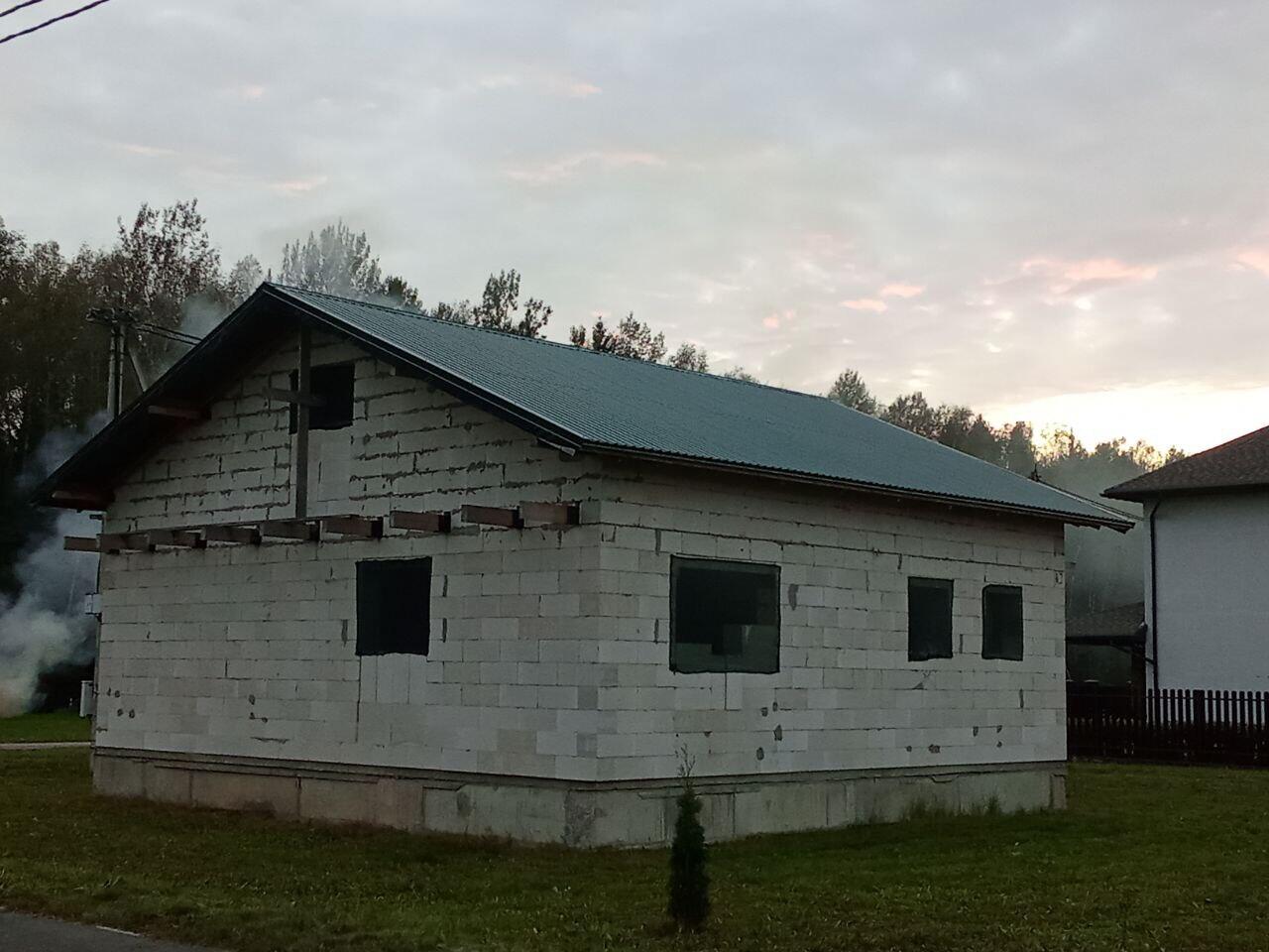 Площадь дома 120 м2 (85 + 35 м2 мансардный этаж), фундамент - ж/б блоки 2.4на0.4на0.6, стены - г/с блока 300мм, балки перекрытия -100*200мм, черновая стяжка - 100 мм. Залито основание под гараж либо иную хозпостройку.