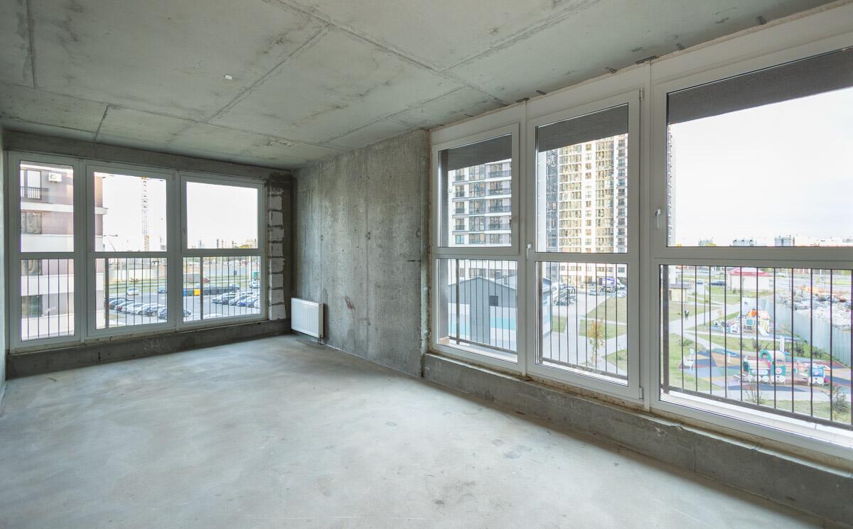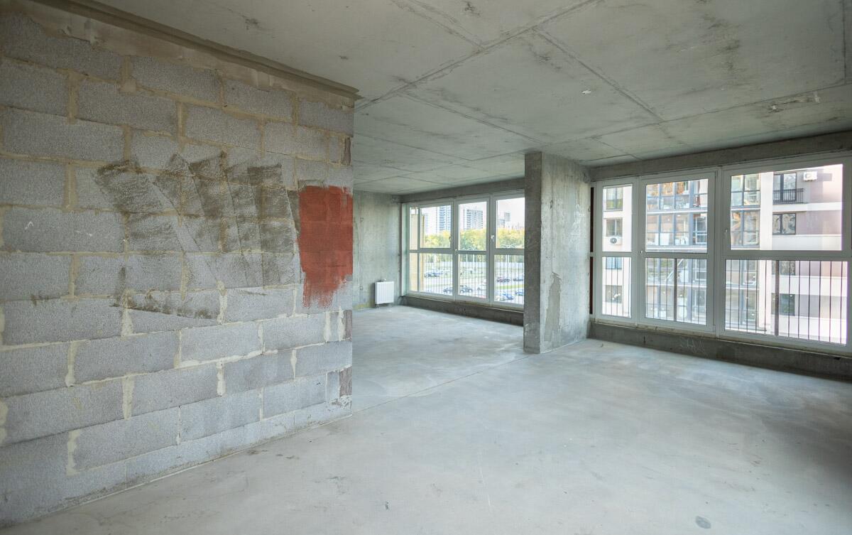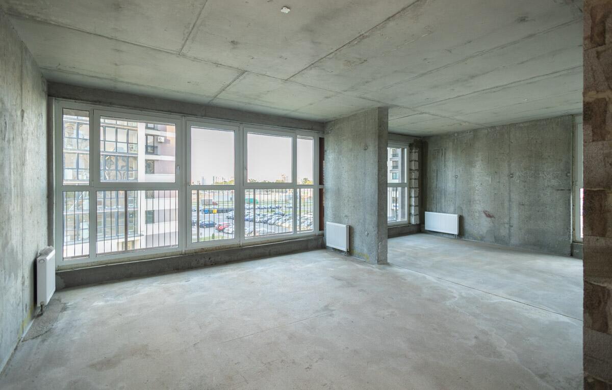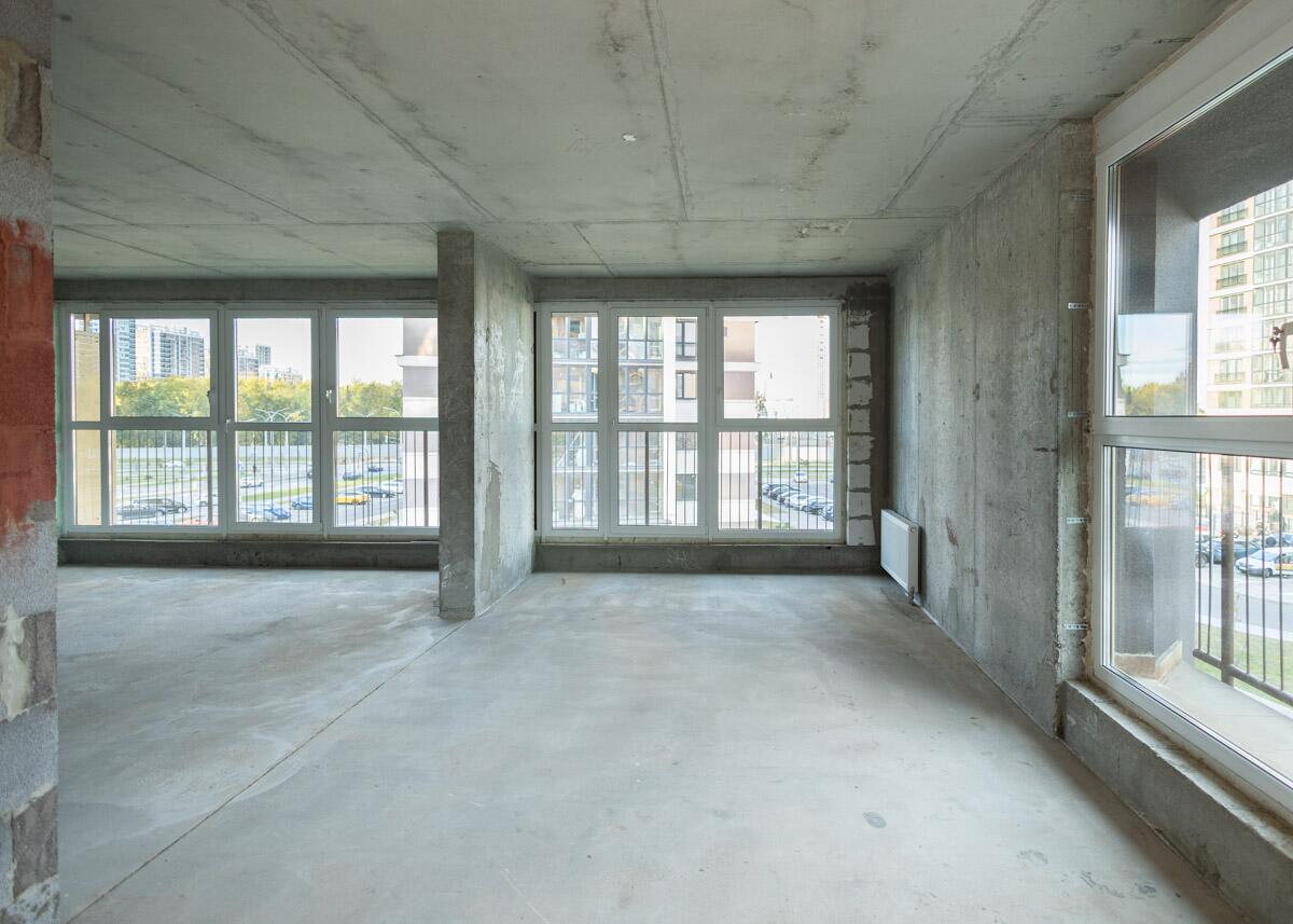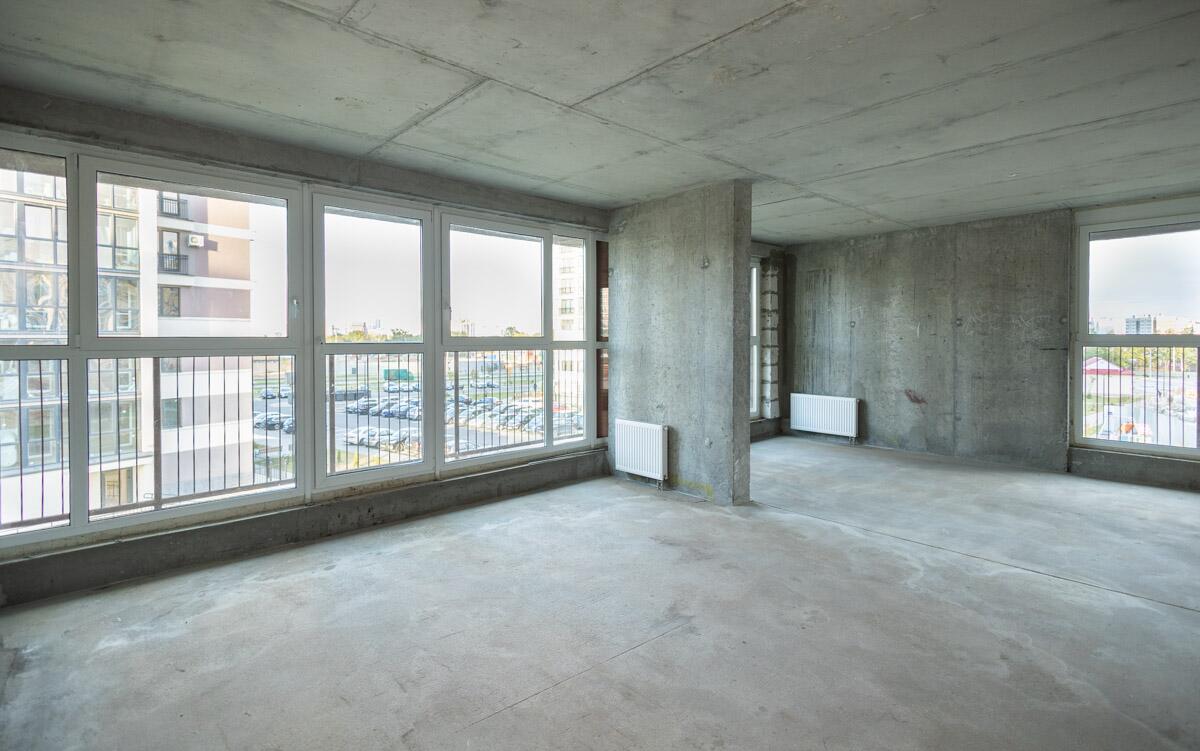Свободная планировка, без отделки, только выставлены перегородки в с/у, все окна панорамные.