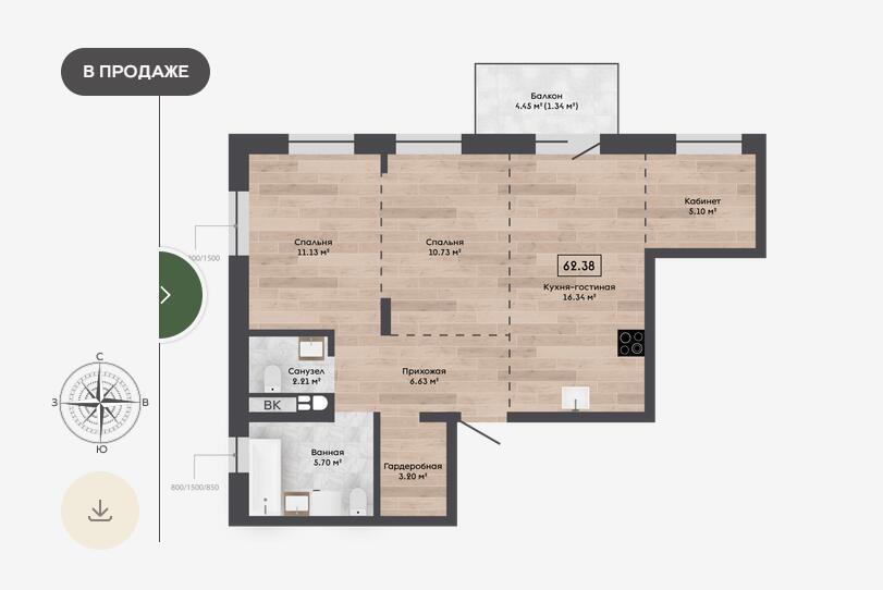 Площадь62.38 м2