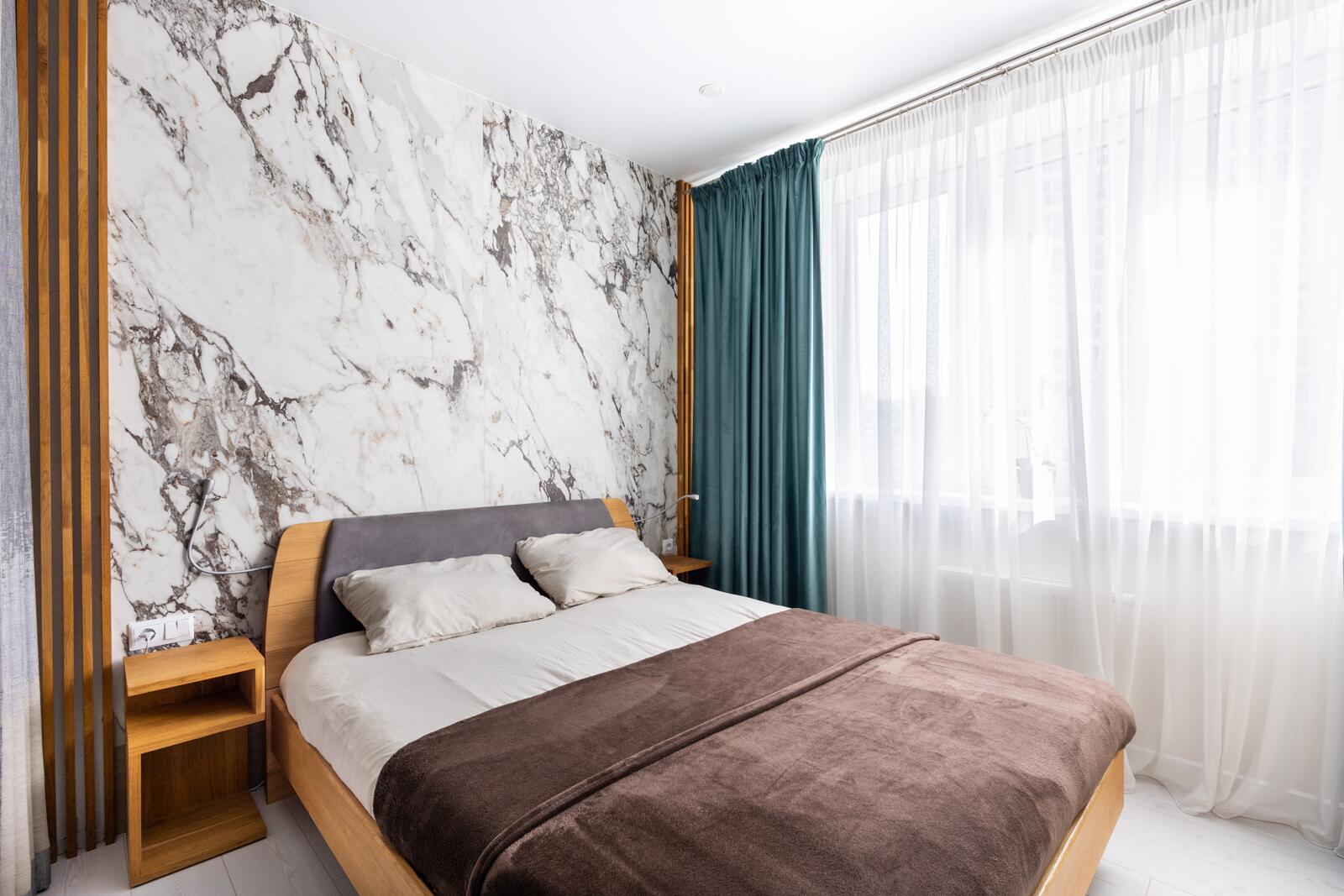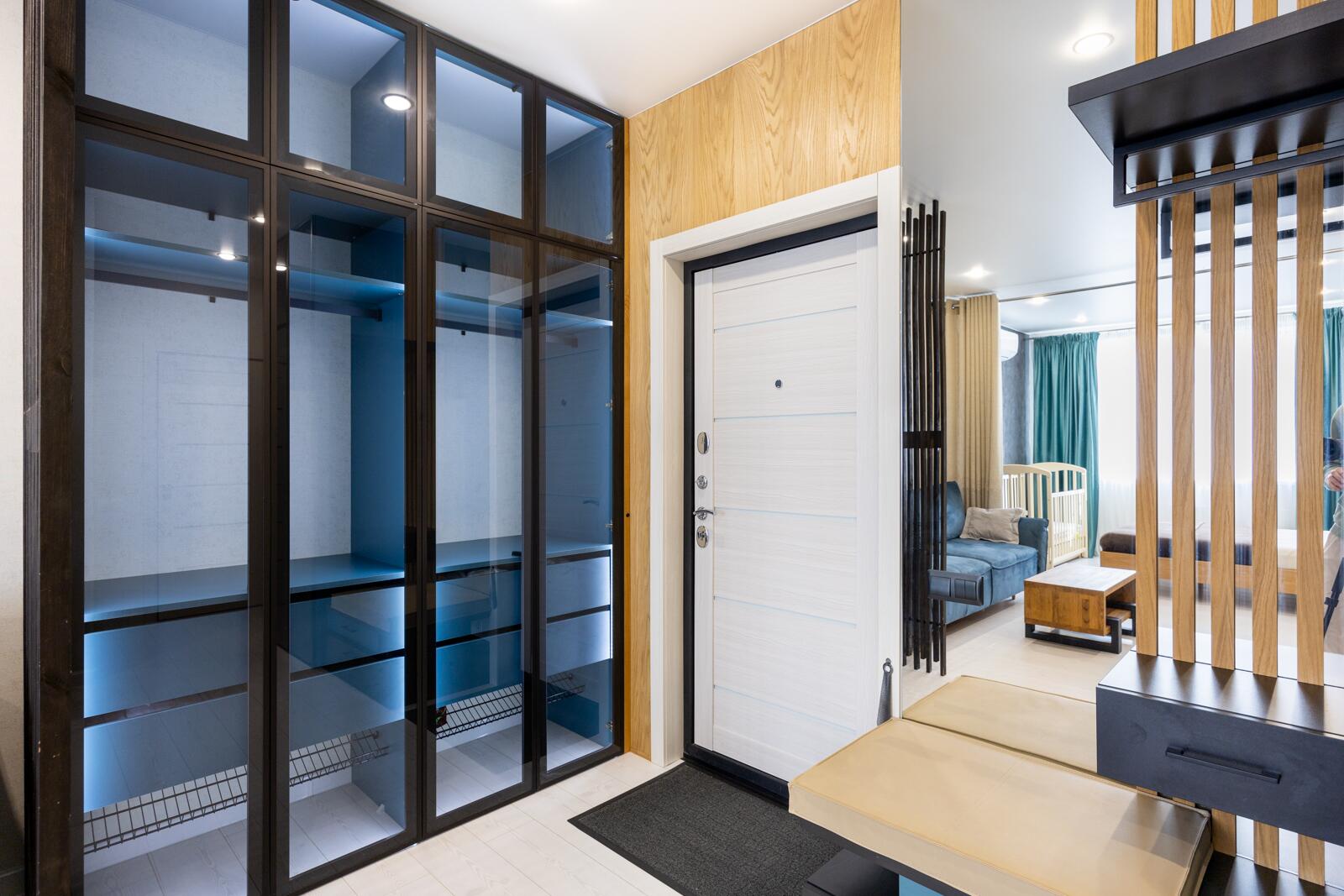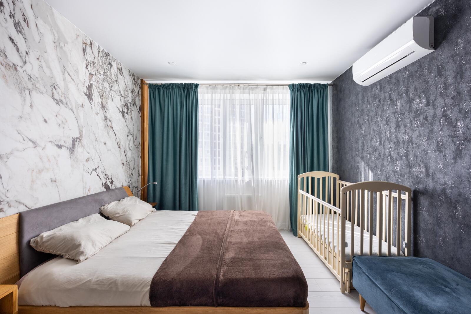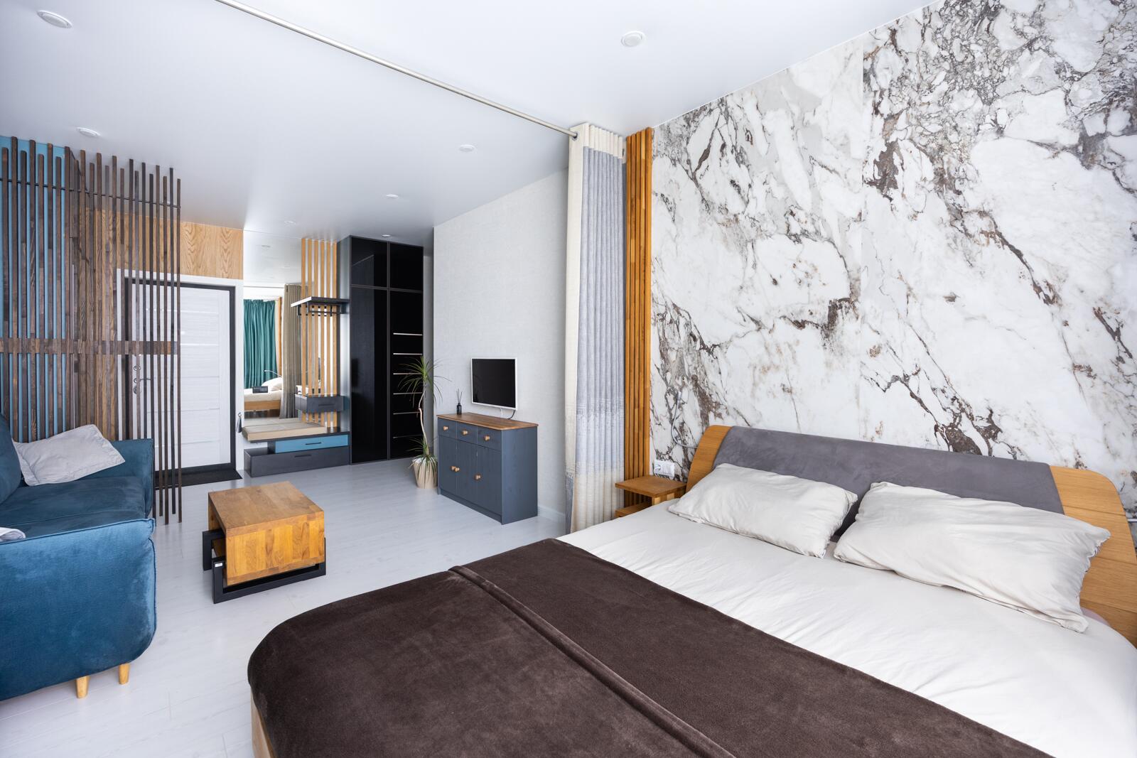 Жилая комната разделена на уютную спальную зону и зону отдыха с телевизором. Элегантные стеклянные шкафы с подсветкой, широкоформатный керамогранит в изголовье кровати, стильные радиаторы и утеплённые трёхкамерные оконные блоки создают атмосферу современного уюта и комфорта в любое время года.