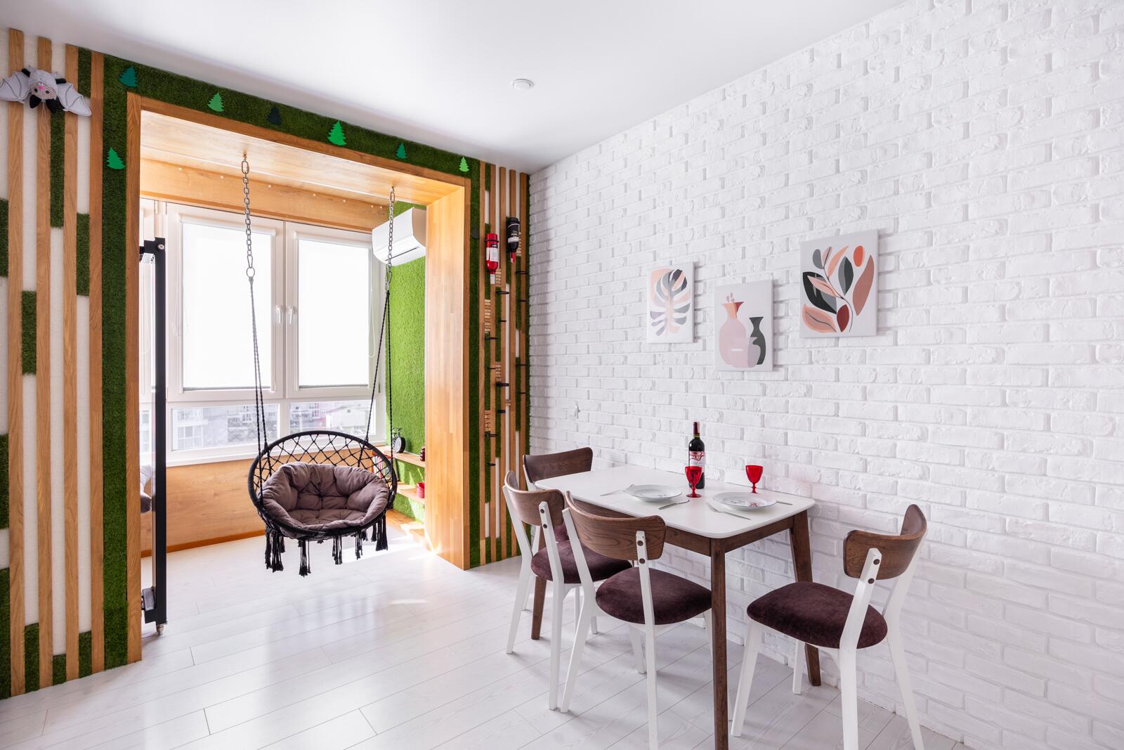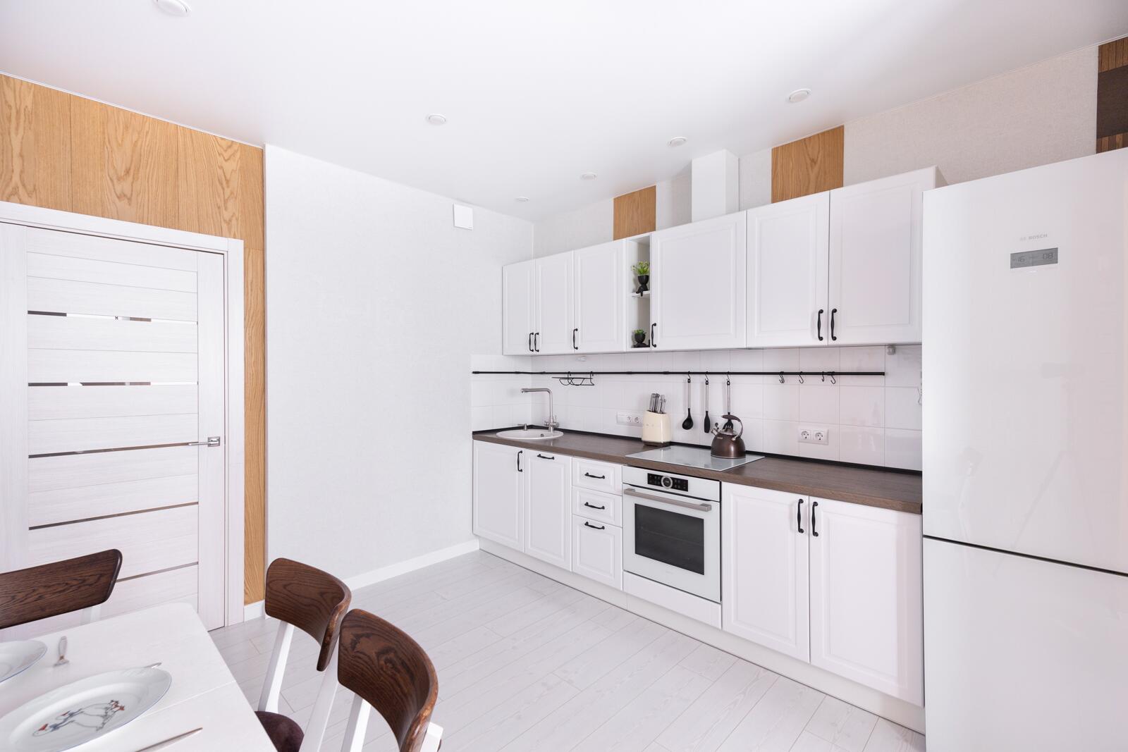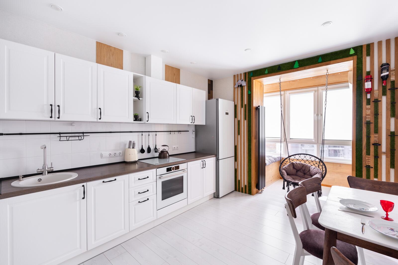Кухня - акцент квартиры. Здесь всё продумано до деталей: стильная мебель, качественная встроенная техника Bosch, эффектное освещение и даже подвесные качели - изюминка интерьера, создающая атмосферу лёгкости и отдыха.