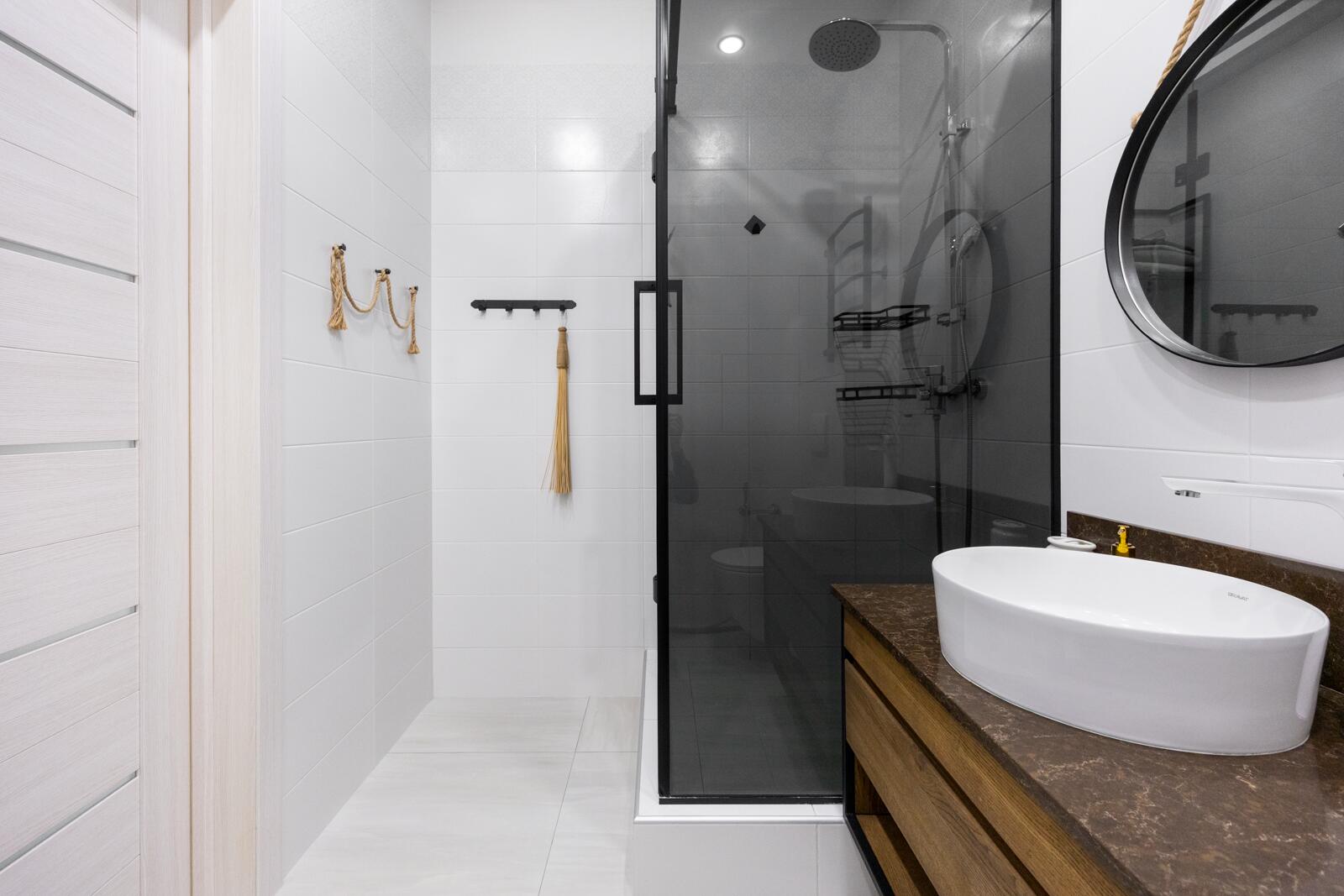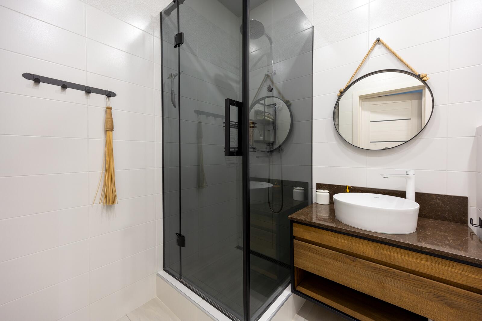 Ванная комната с душевой кабиной оформлена в светлых тонах, с качественной сантехникой и аккуратными современными деталями.