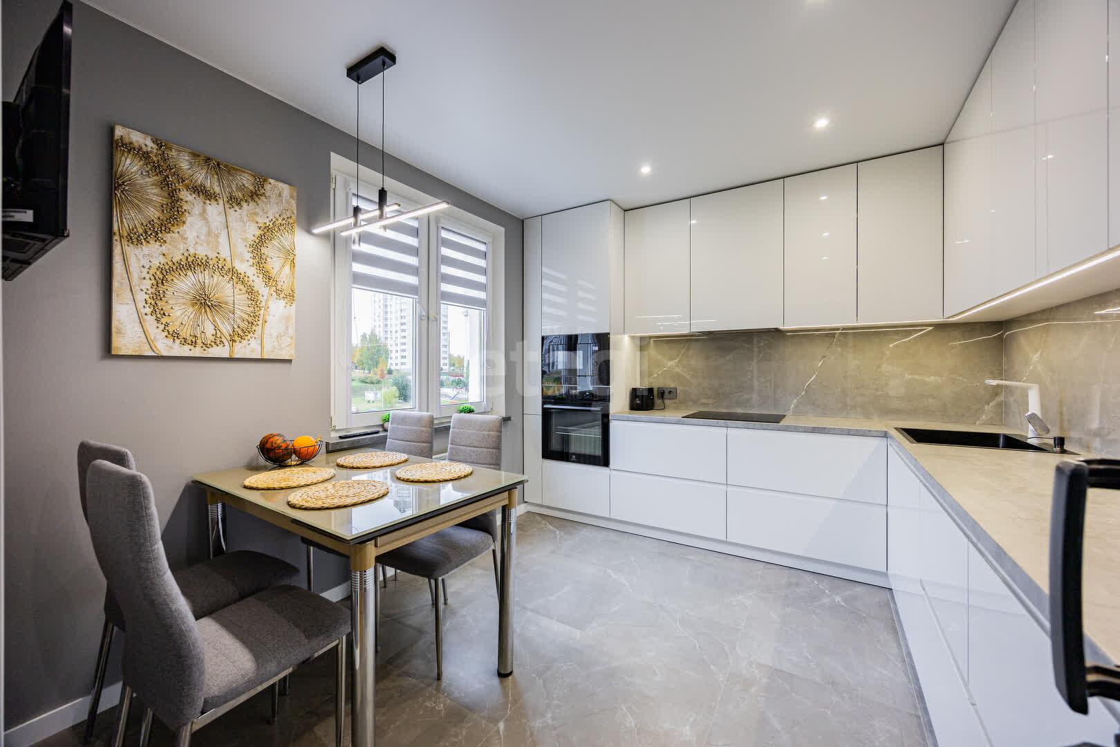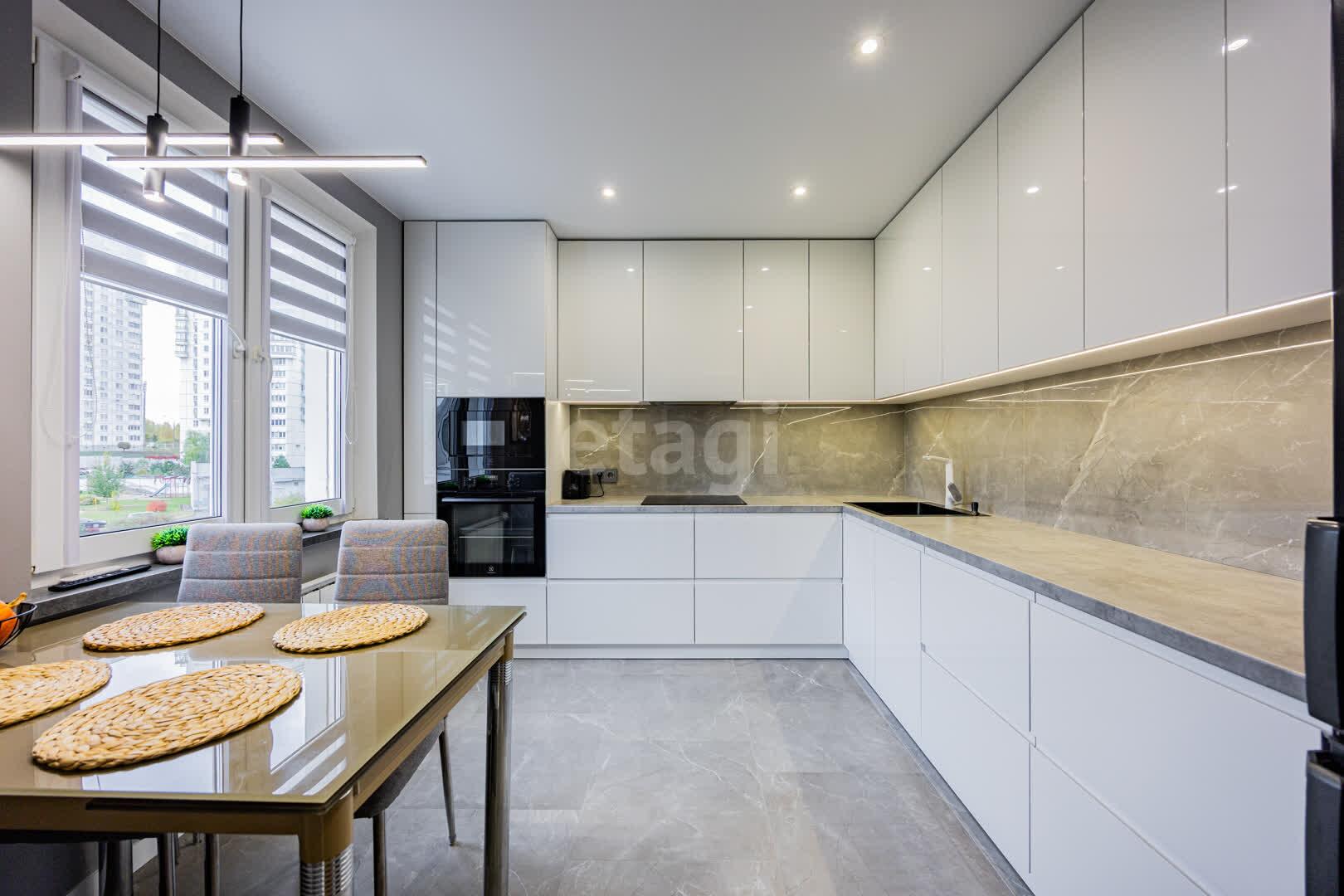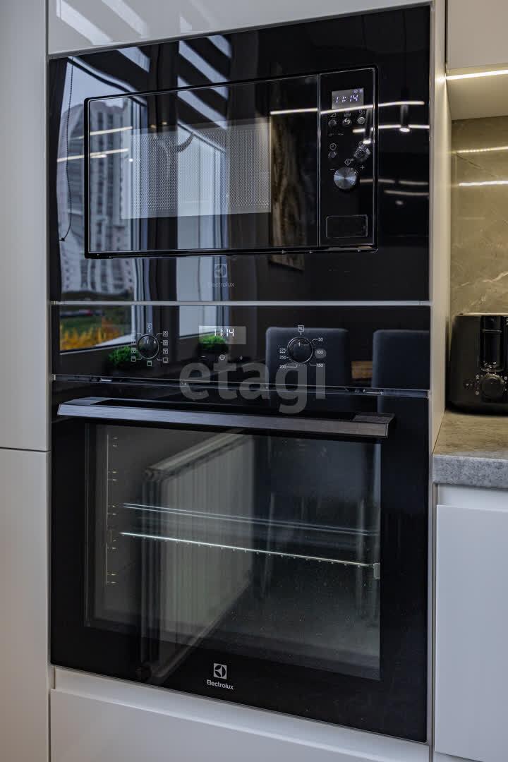 Современная кухня 10.2 м.кв, оборудована современным кухонным гарнитуром, фасады МДФ крашенный, доводчики и подъёмные механизмы Blum. Оснащенна высококачественной встроенной техникой, подойдет как для кулинарных экспериментов, так и для приемов гостей: холодильник, индукционная варочная поверхность, духовой шкаф и СВЧ печь Electrolux, посудомоечная машина Bosh, встроенная вытяжка и подсветка рабочей зоны.
