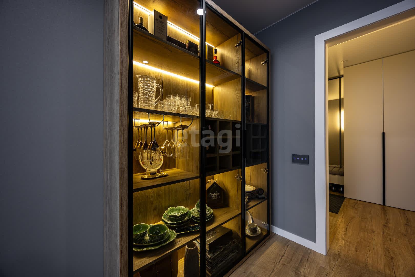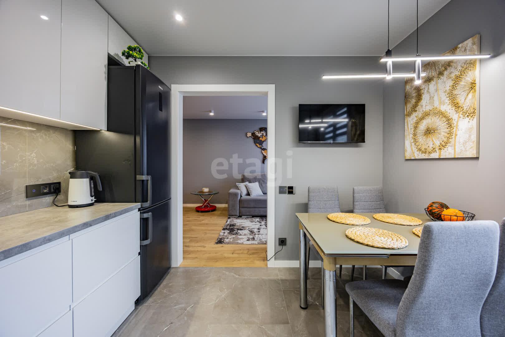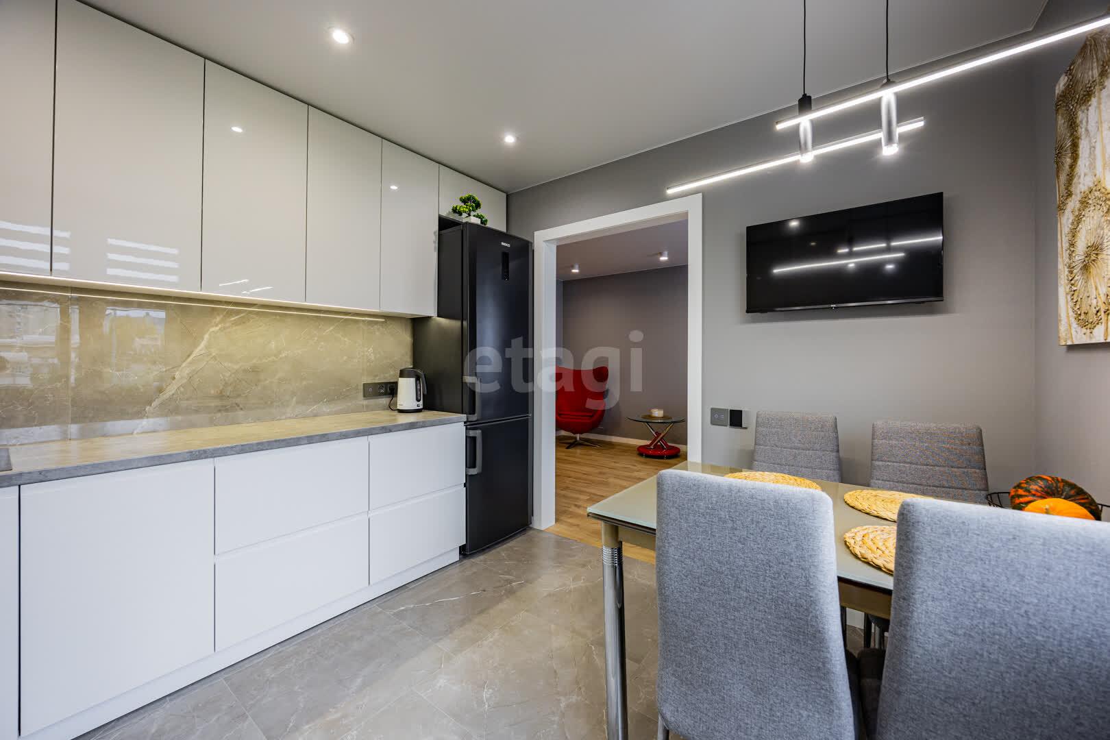 Современная кухня 10.2 м.кв, оборудована современным кухонным гарнитуром, фасады МДФ крашенный, доводчики и подъёмные механизмы Blum. Оснащенна высококачественной встроенной техникой, подойдет как для кулинарных экспериментов, так и для приемов гостей: холодильник, индукционная варочная поверхность, духовой шкаф и СВЧ печь Electrolux, посудомоечная машина Bosh, встроенная вытяжка и подсветка рабочей зоны.