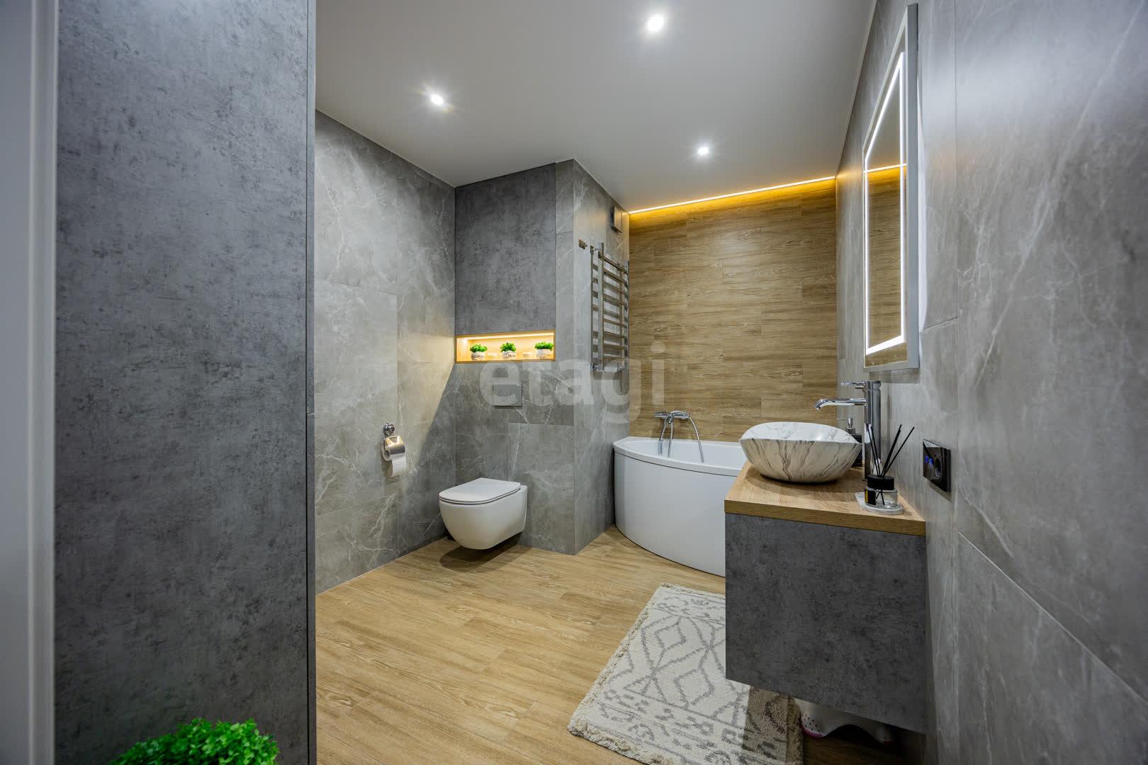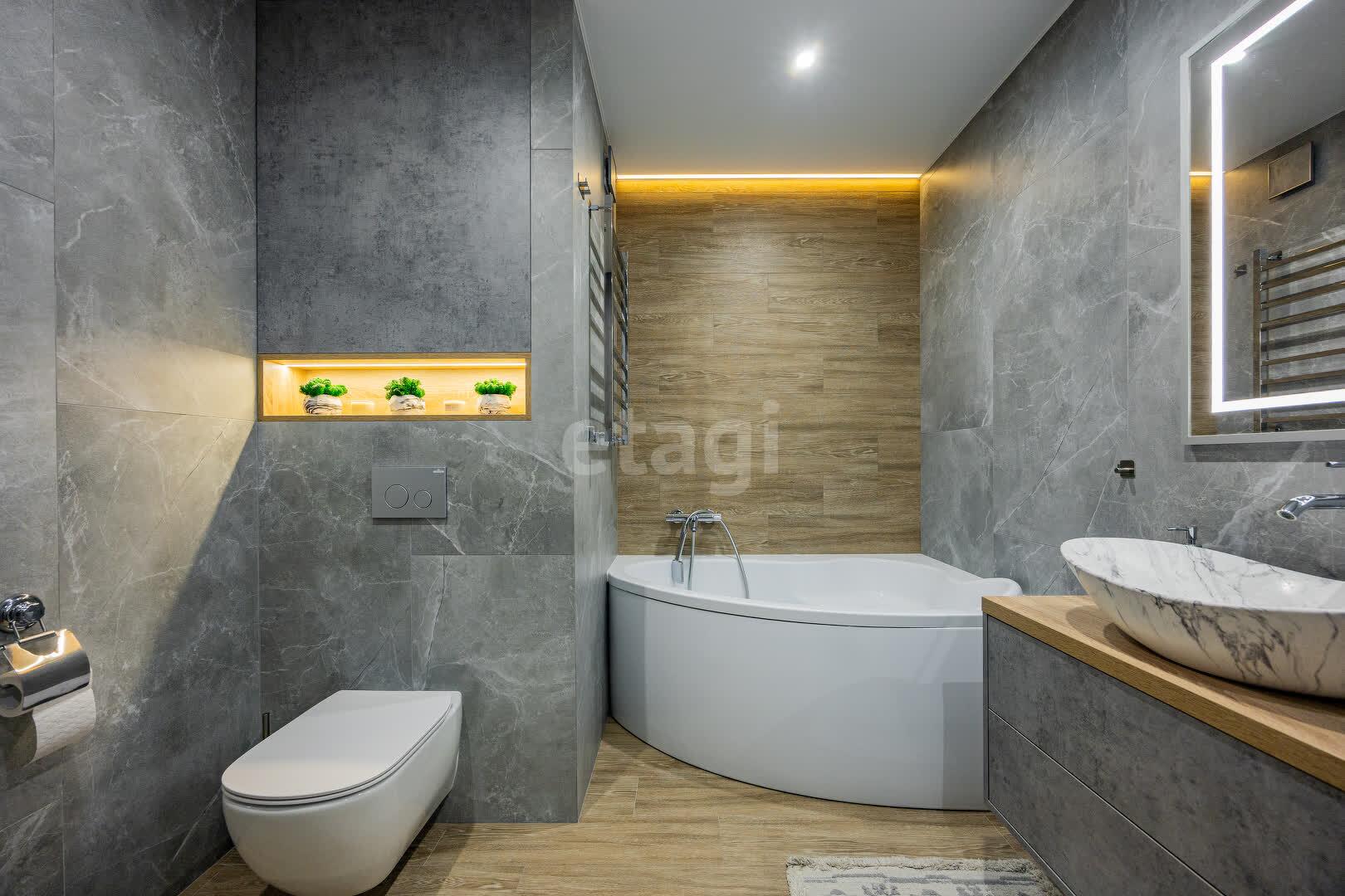 Роскошный совмещённый санузел 7.6 м.кв. облицован керамогранитной плиткой, оборудован угловой ванной, хозяйственными шкафами скрытого монтажа, установлен бойлер, стиральная машина, унитаз с инсталляцией и вихревой системой слива «Торнадо».