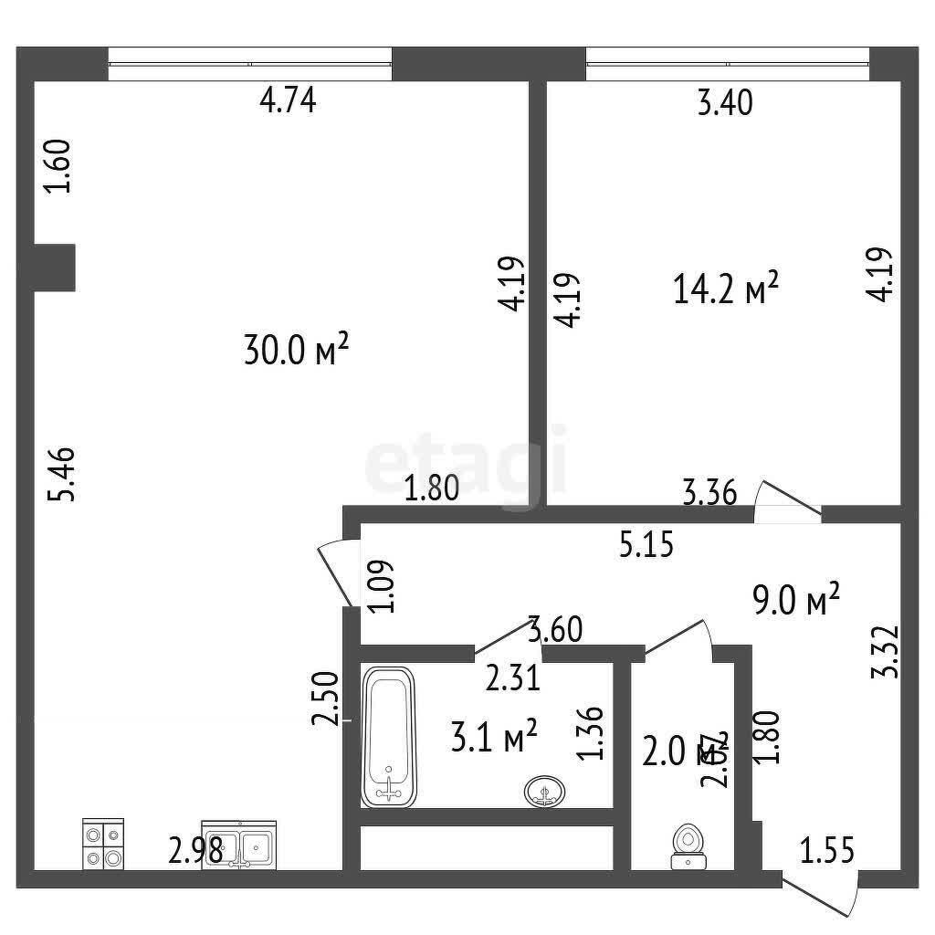 Общая площадь - 58,3м2 (Жилая– 44,2м2)