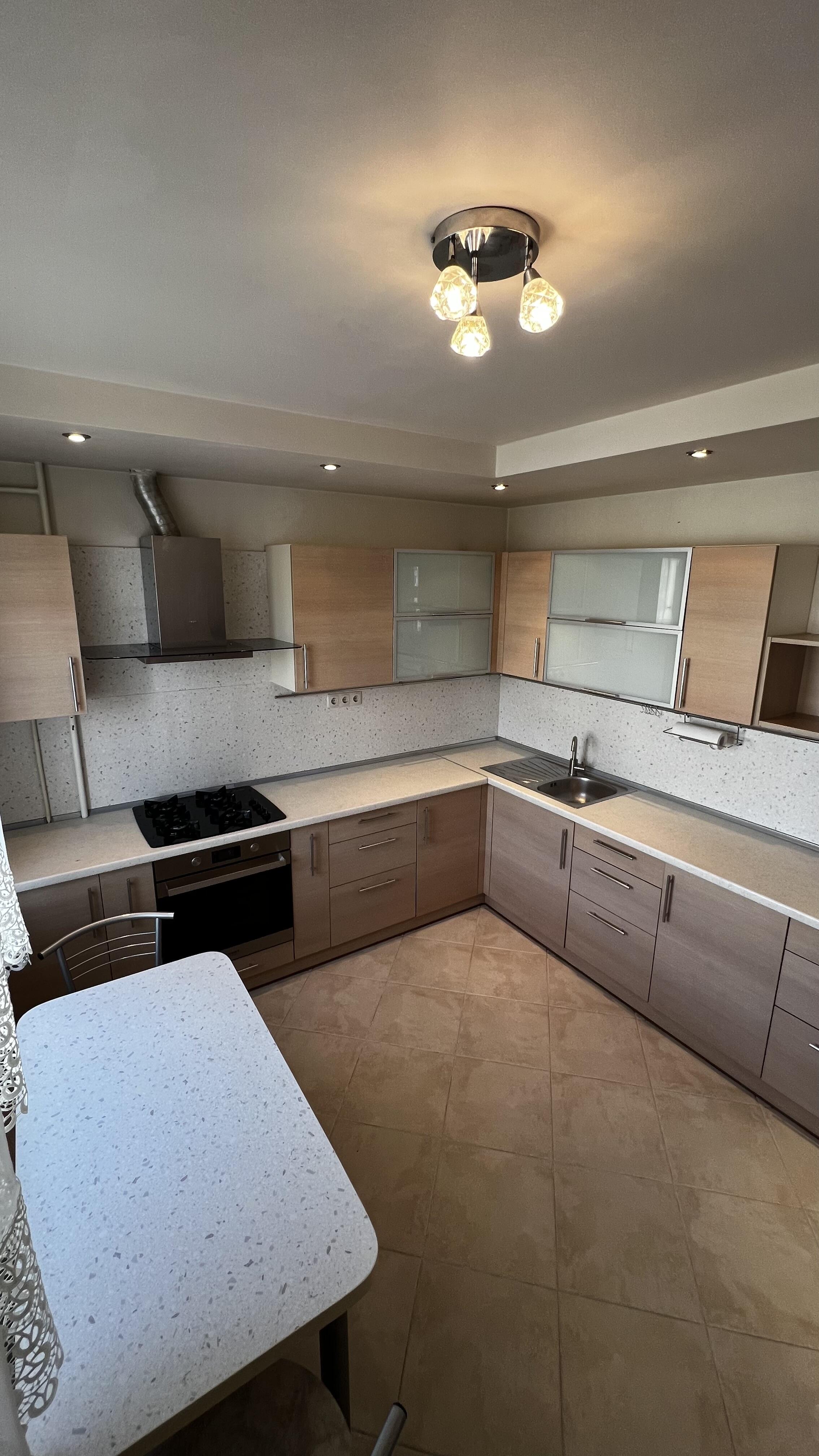 Просторная угловая кухня оснащена современной техникой и удобной рабочей зоной. Здесь будет одинаково комфортно и готовить, и проводить семейные ужины.