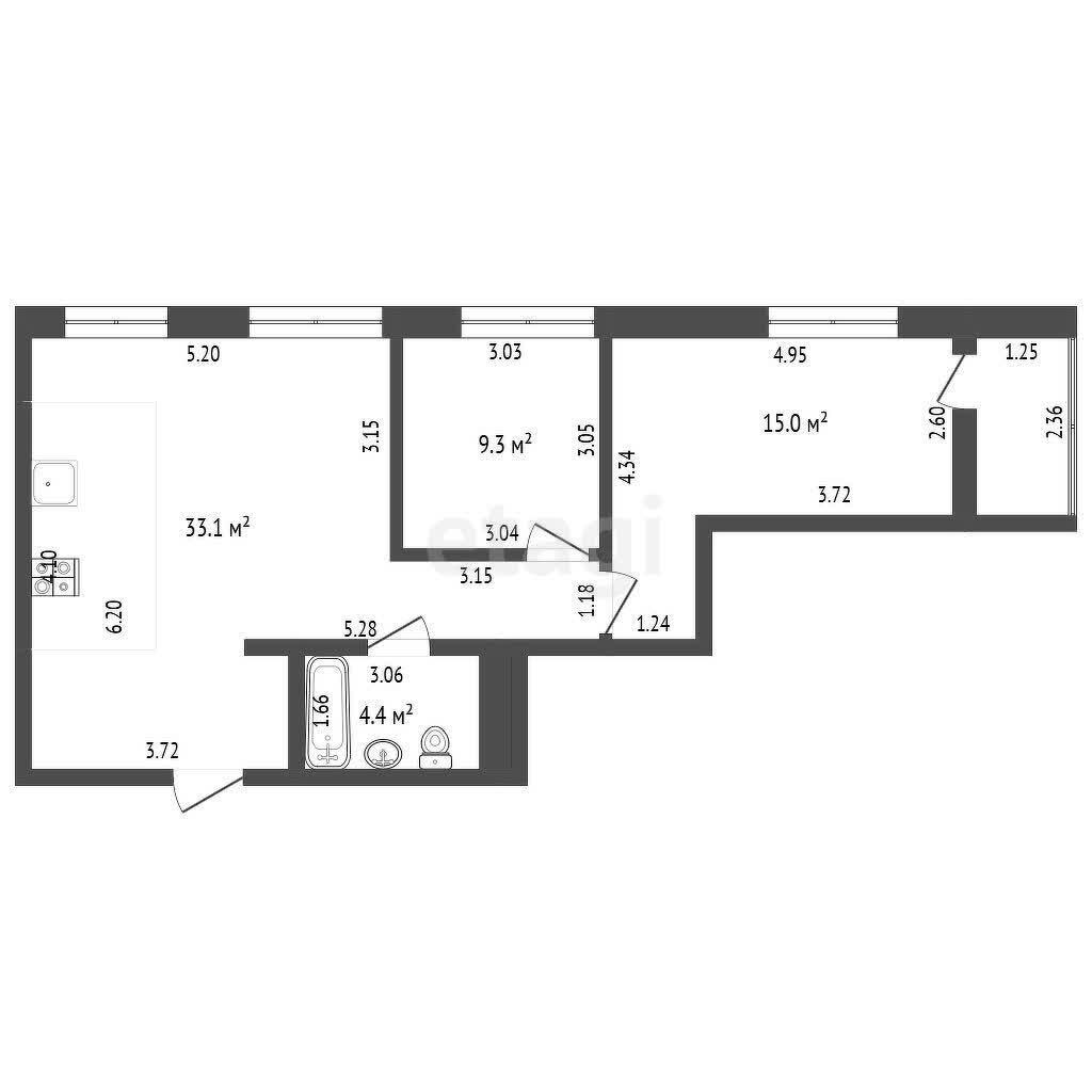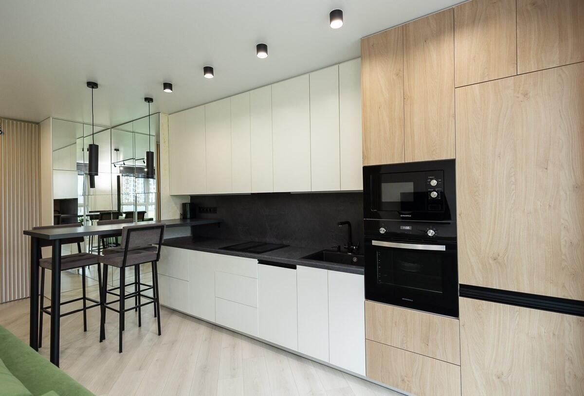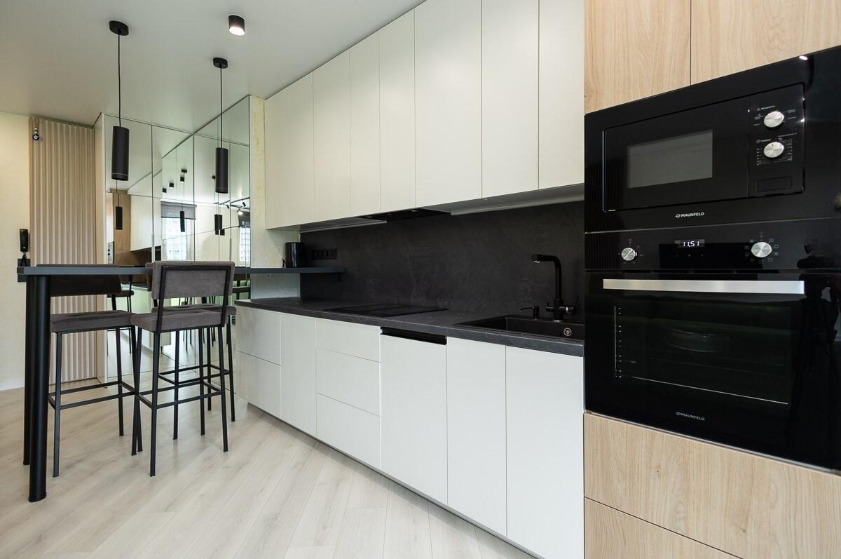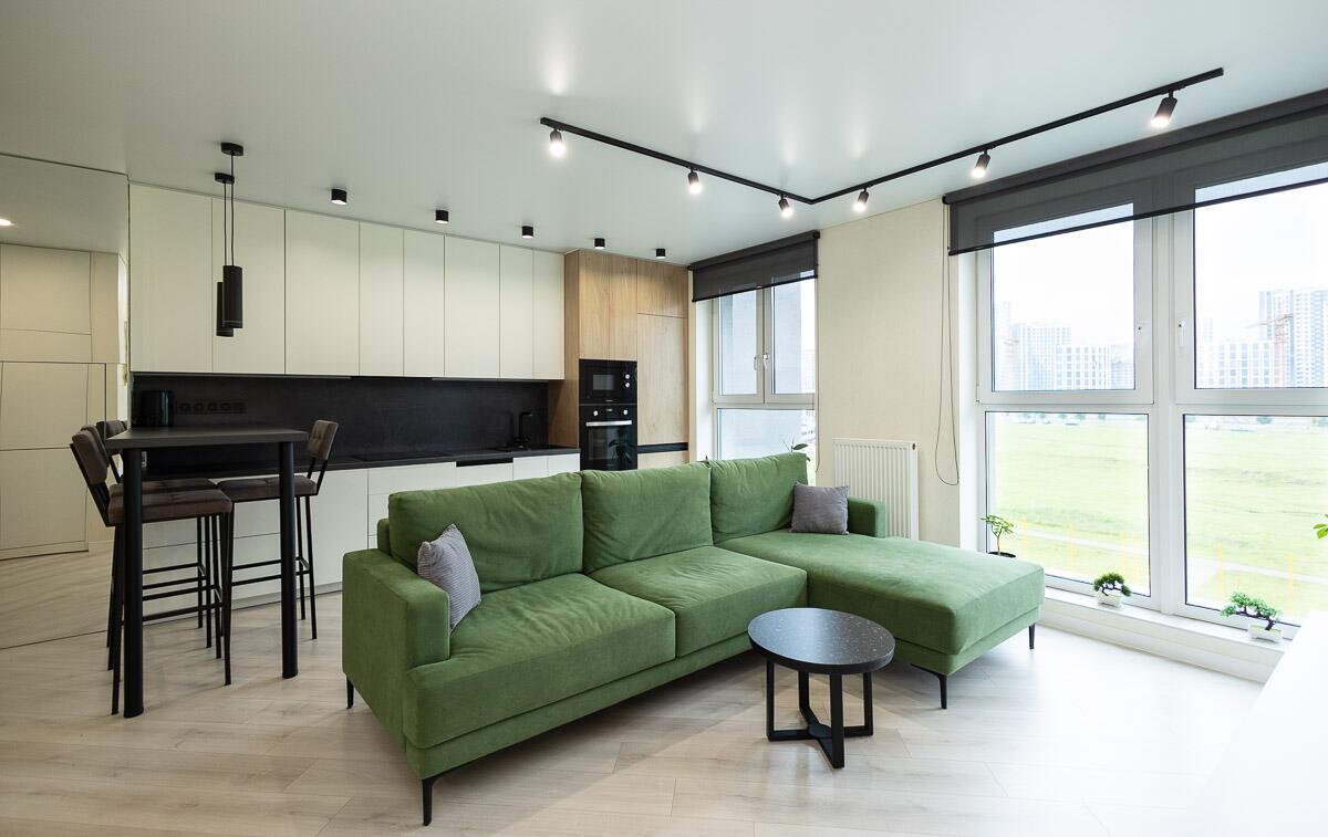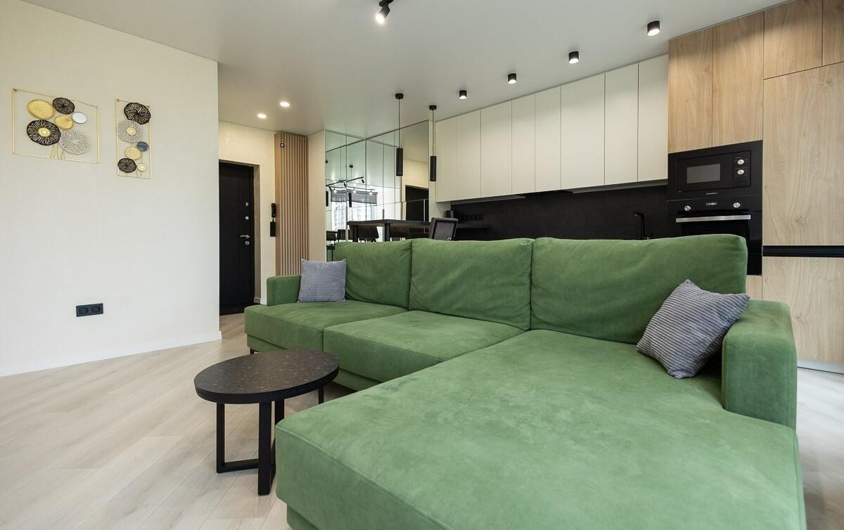 В квартире просторная гостиная с кухонным оборудованием, где может собираться вся семья для совместного отдыха. Кухня оборудована всей необходимой техникой. Две раздельные спальни и совмещенный просторный санузел.