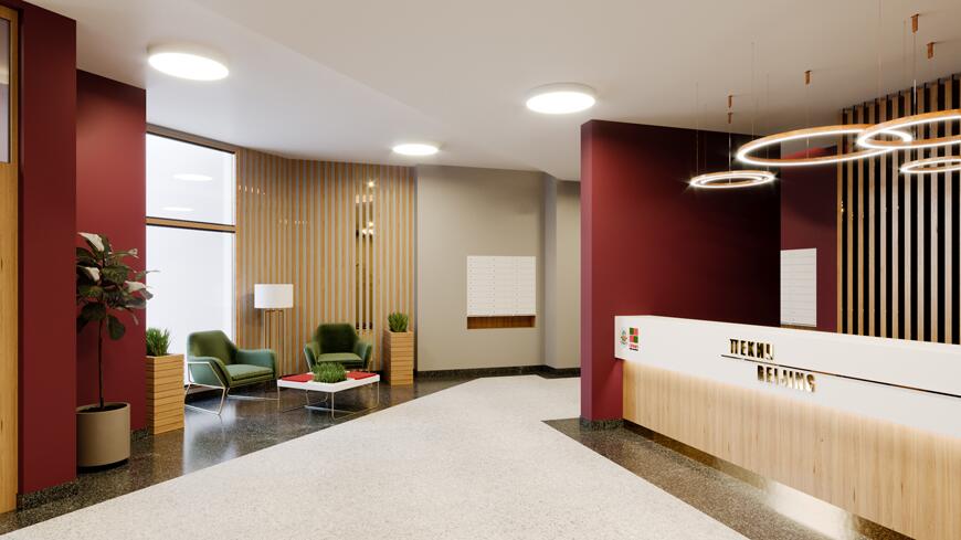 • В лобби дома оборудовано место для отдыха или ожидания, рядом - стойка для консьержа и туалетная комната с пеленальным столиком. Здесь же расположен байк бокс для хранения детских колясок и велосипедов.
