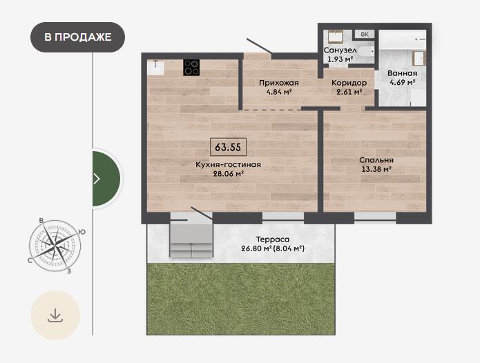 Площадь63.55 м2