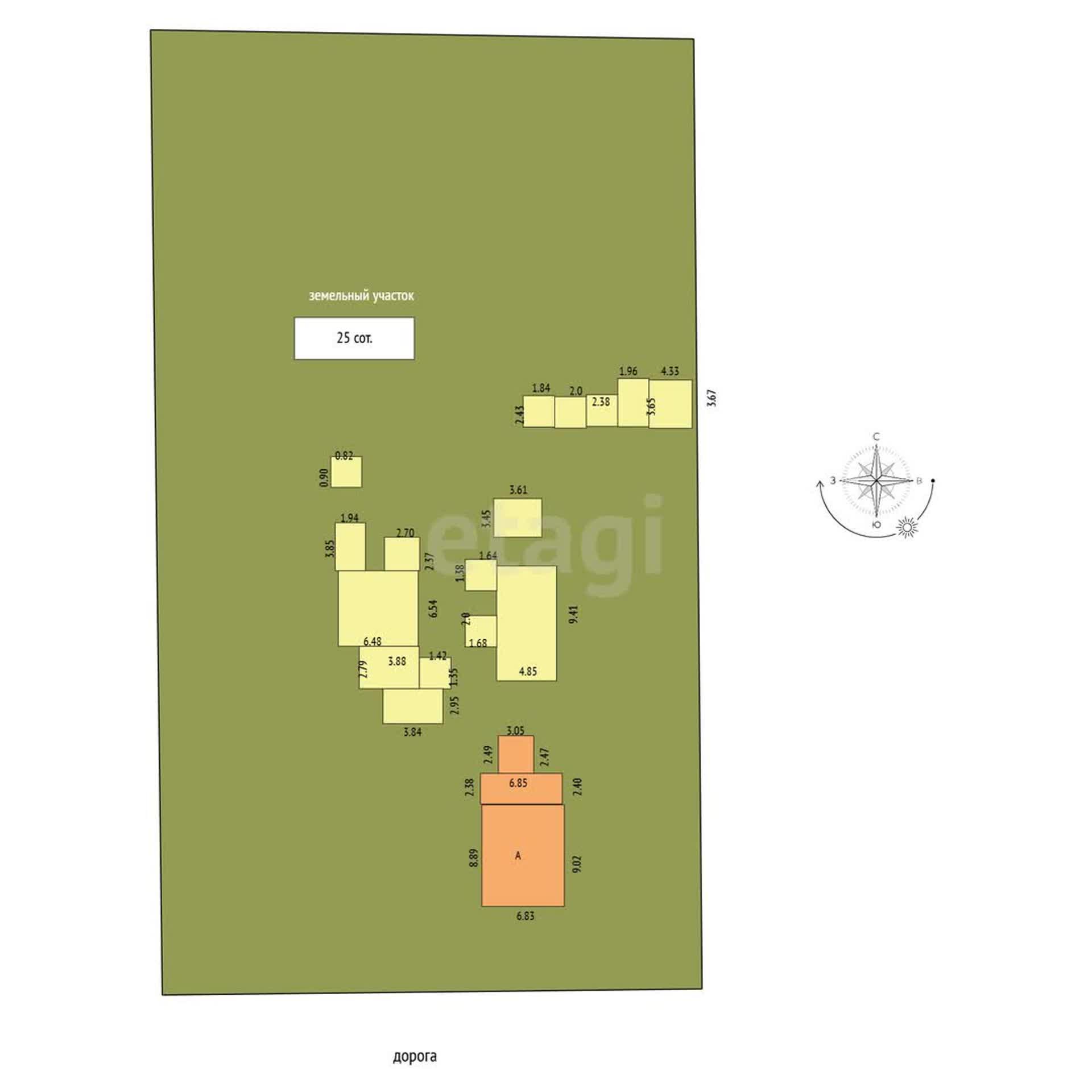 Участок 25 соток. Пожизненно наследуемое владение. На участке расположены дом с верандой, летняя кухня, баня, навес, хоз.постройки. Участок огорожен забором. Дорога к участку асфальтирована и освещена, дороги очищаются от снега зимой регулярно.