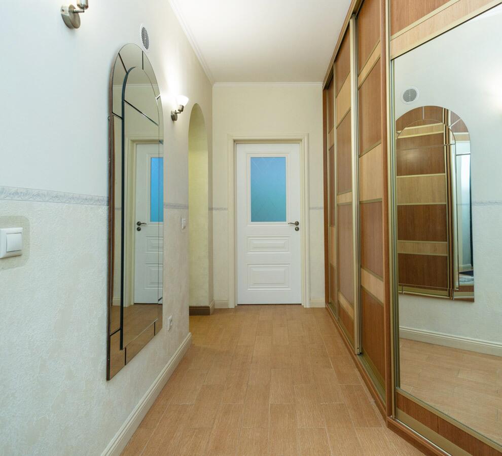 На полу уложена паркетная доска, в корридоре и на кухне - плитка.