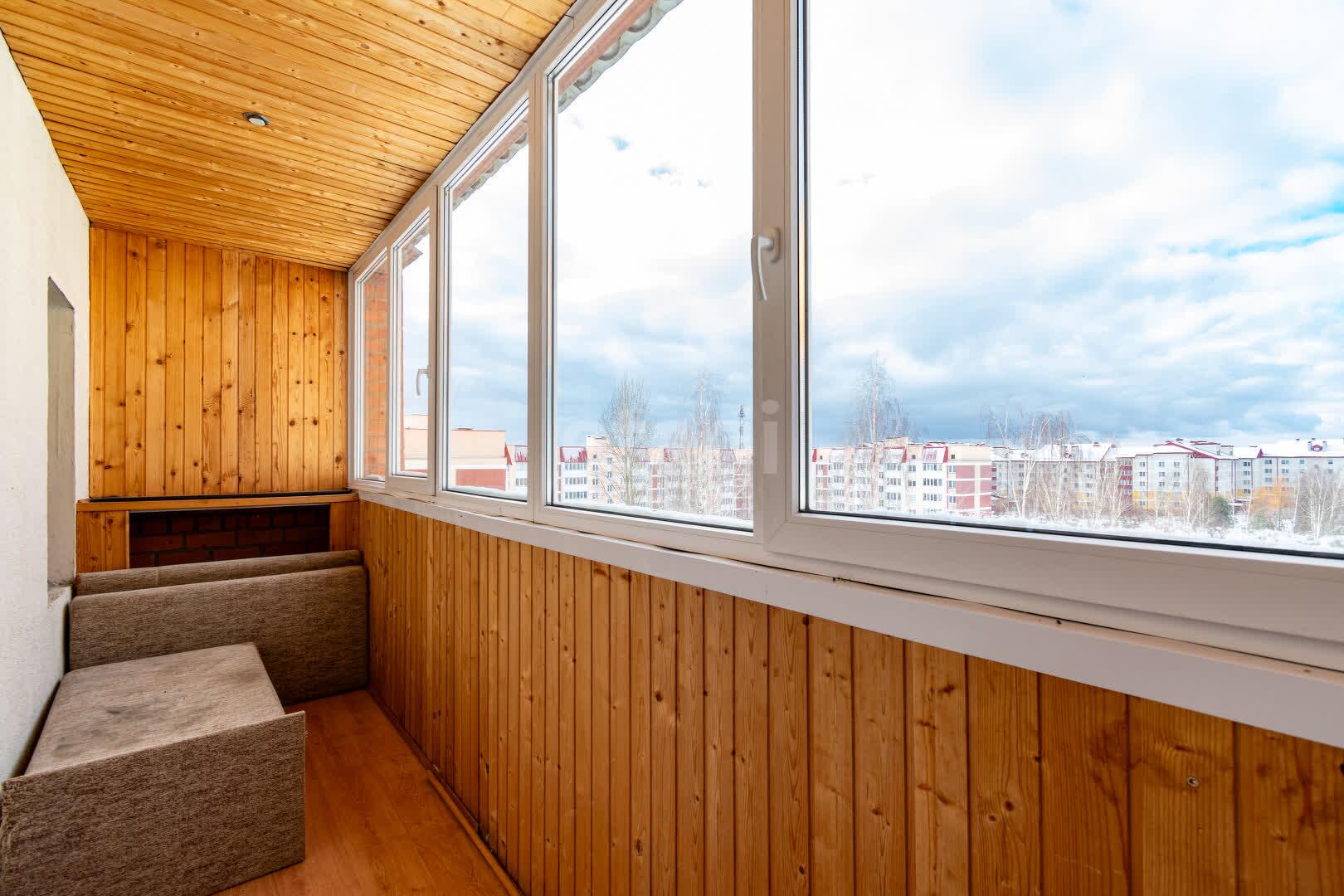 На лоджии установлены стеклопакеты ПВХ, обшита вагонкой.