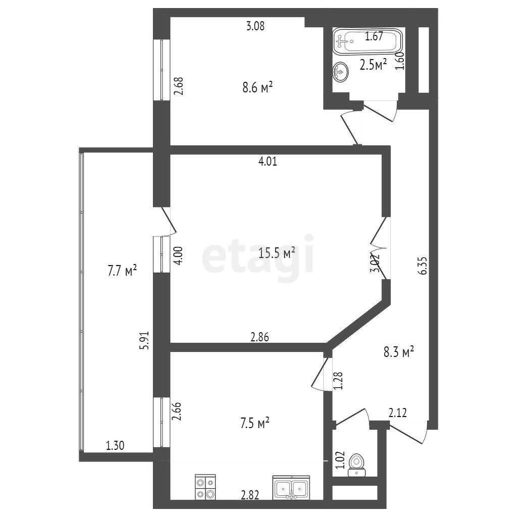 Площадь по СНБ – 48.7 м2, жилая – 24.1 м2, кухня – 7.5 м2.