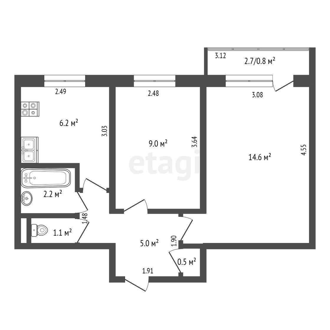 Раздельные жилые комнаты: 9 м2 и 14,6 м2.