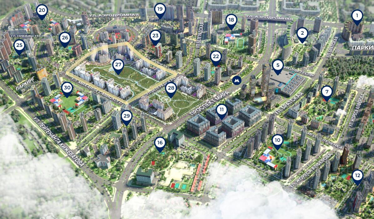 Есть собственная инфраструктура – школа, детский сад, взрослая и детская поликлиника, медицинский центр, кафе и магазины, парковки и заправки, спортивные залы и фитнес-центры.