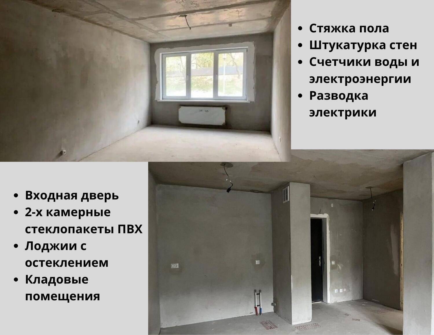 Черновая отделка; Входная дверь, из сантехпосуды – унитаз; Установка счетчиков воды и электроэнергии; Стеклопакеты ПВХ двухкамерные в квартирах, лоджии остеклены; Разводка электрики с установкой розеток и выключателей, подводка оптоволокна; · Высота потолков 2,5 м (21 этаж – 3м);