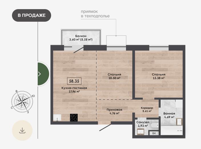 Площадь58.35 м2