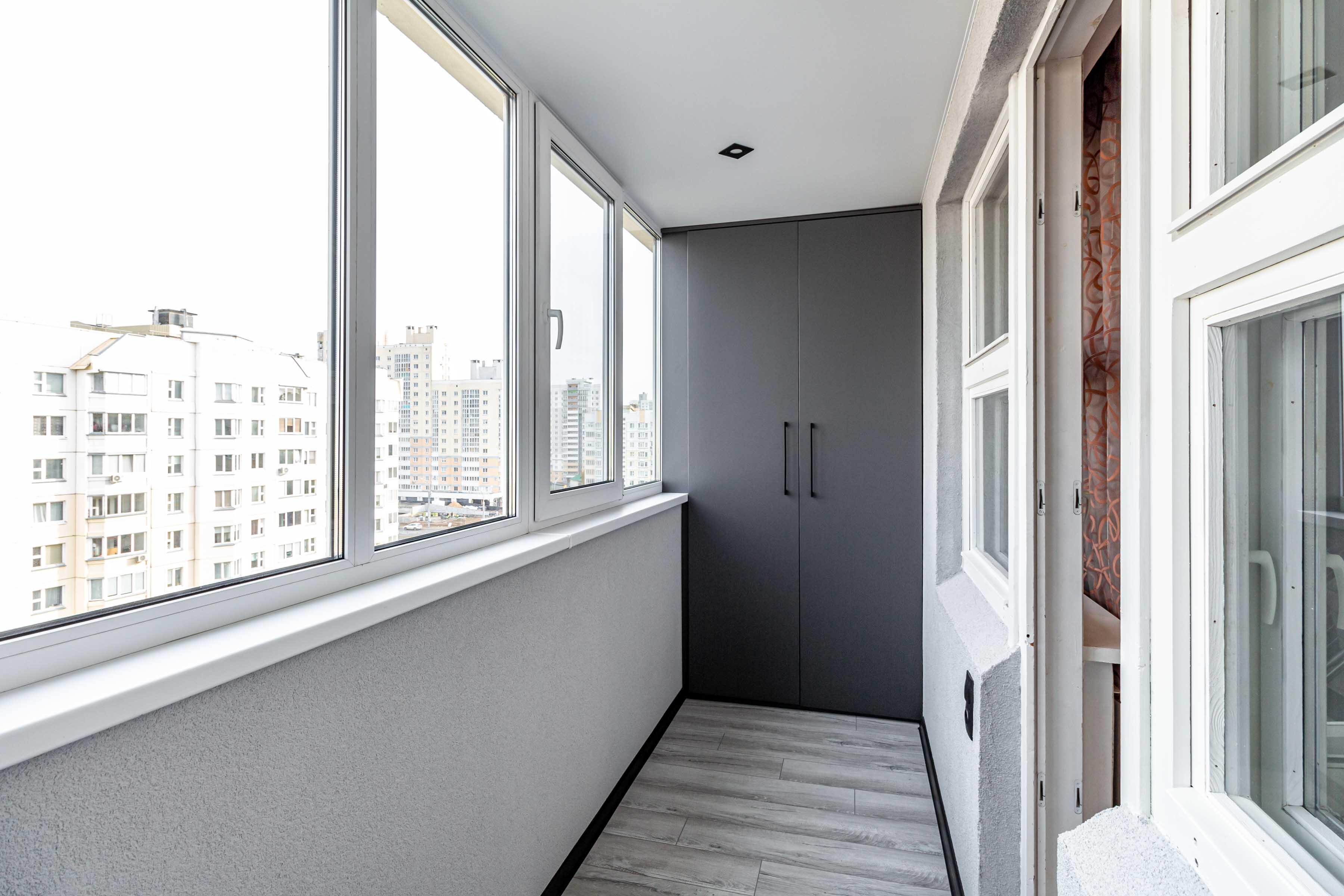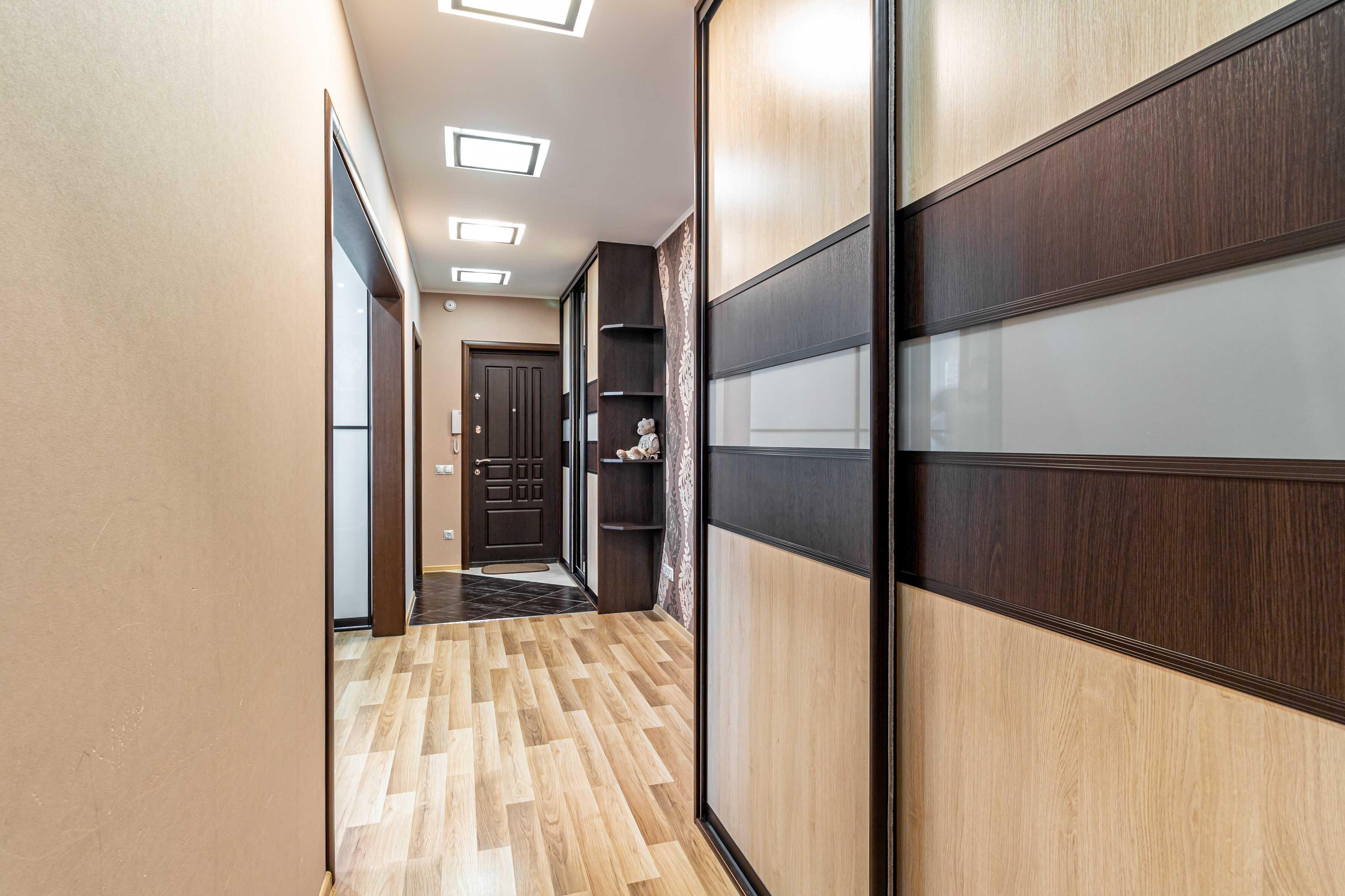 Зал. Глубокий встроенный шкаф (глубина 70 см), предусмотрено рабочее место (стол).