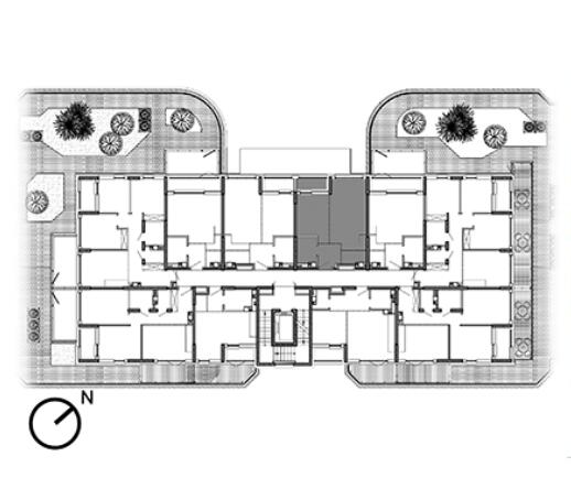 Всего 10 квартир на этаже. 8 квартир – с собственными огражденными террасами. Причем в 2-х квартирах сразу по 2 террасы. Со всех террас есть выход на эксплуатируемую кровлю стилобата.