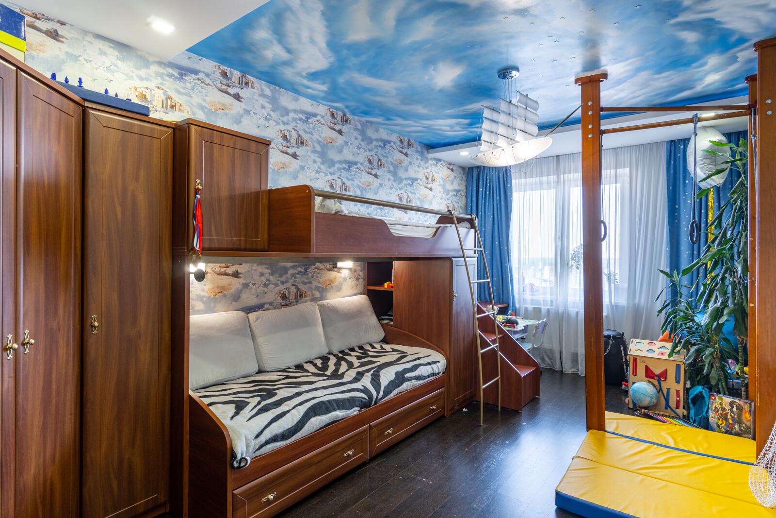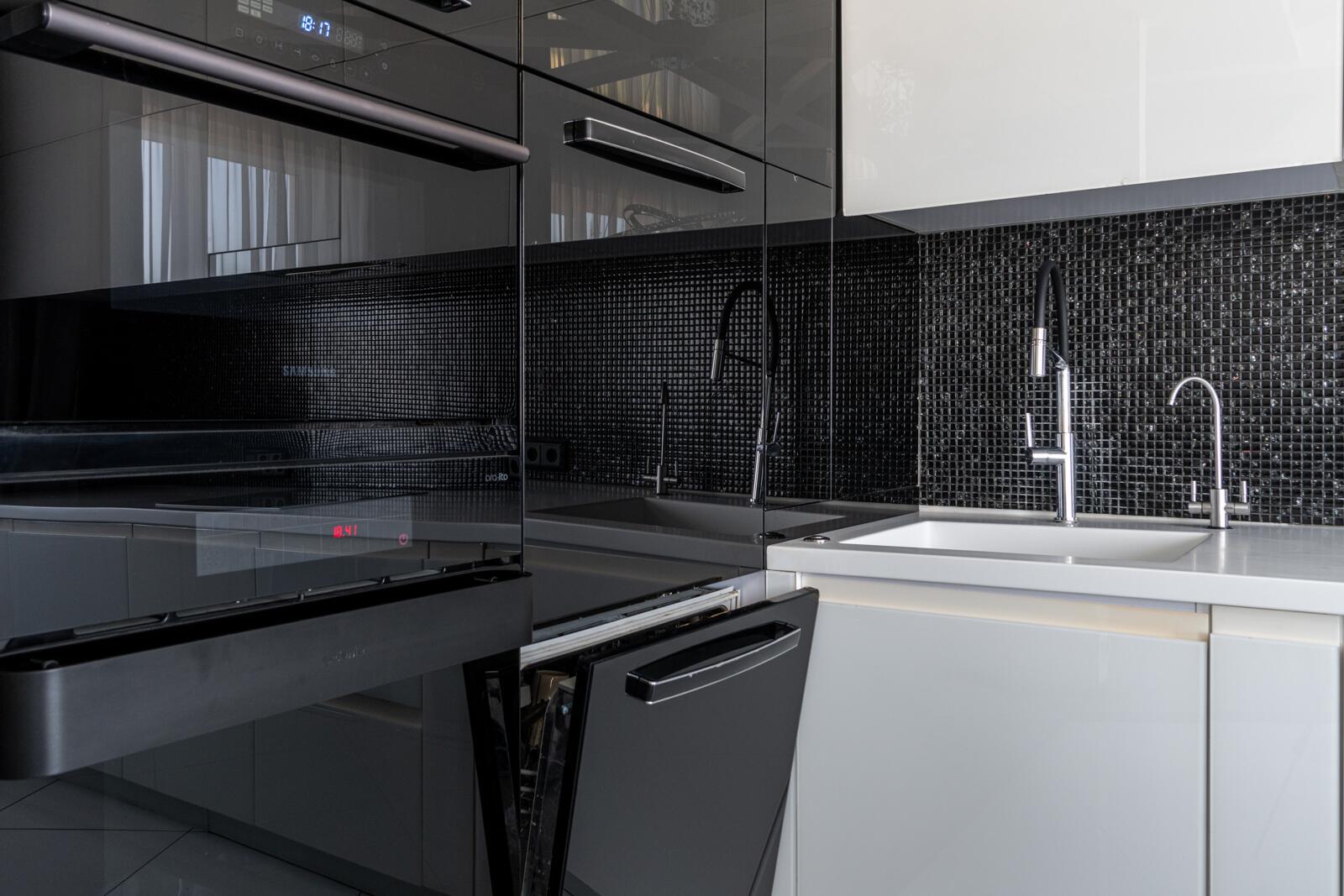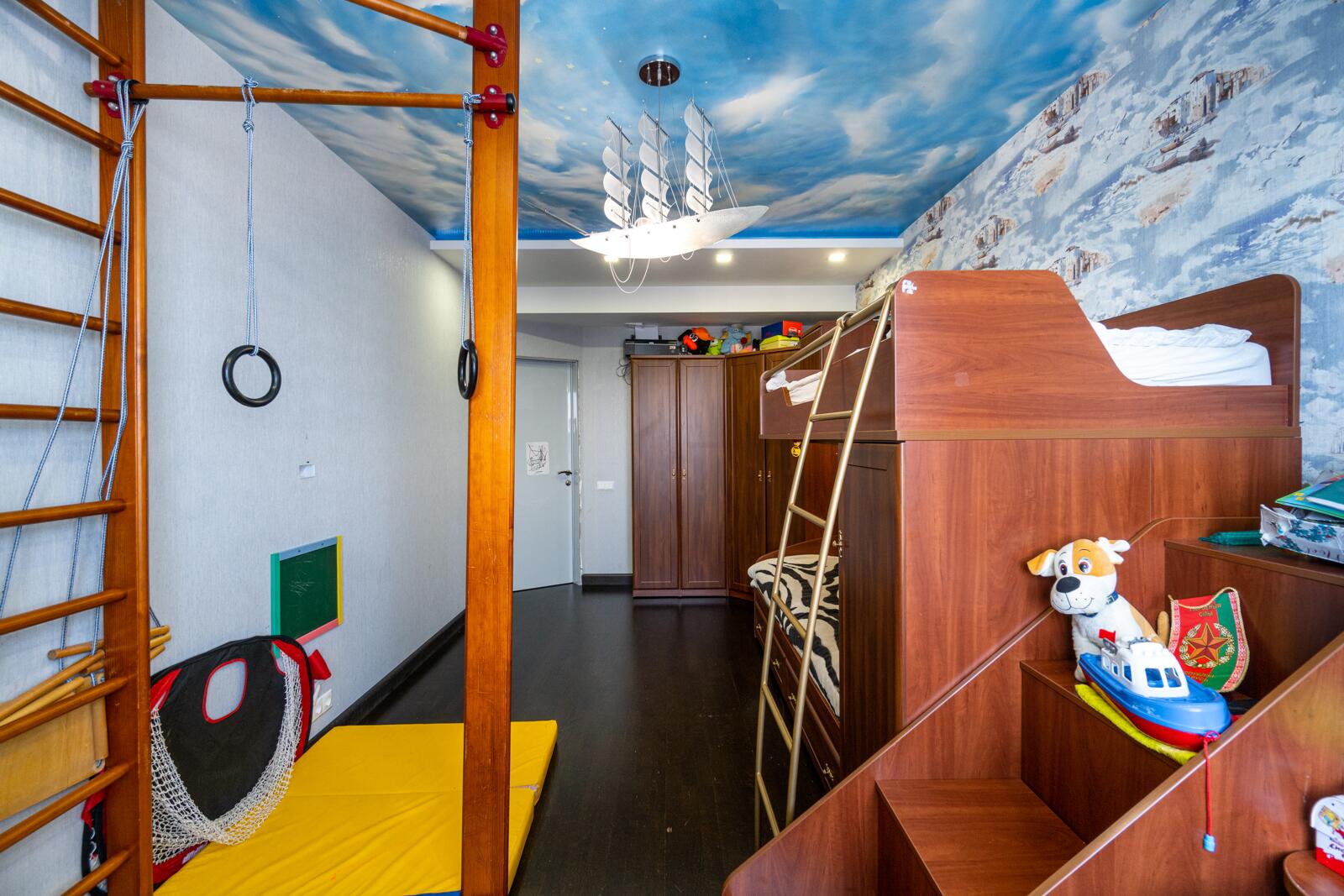 Две изолированные спальни и просторная кухня-гостиная. Хозяйская спальня — с выходом на лоджию и отдельной гардеробной. В детской — продуманное рабочее место у окна и несколько сценариев освещения для комфортного времяпрепровождения. В гостиной и в основной спальне — кондиционеры Mitsubishi Electric.Кухня-гостинаяСтоловая зона на 6 человек с возможностью комфортно разместить до 12 гостей. Кухня на фурнитуре Blum; техника Liebherr / Gorenje / Samsung; холодильник Side-by-Side, посудомоечная машина, измельчитель пищевых отходов, система водоочистки. Акустическая система установлена — фильмы и музыка звучат насыщенно и мягко. Тёплый пол.