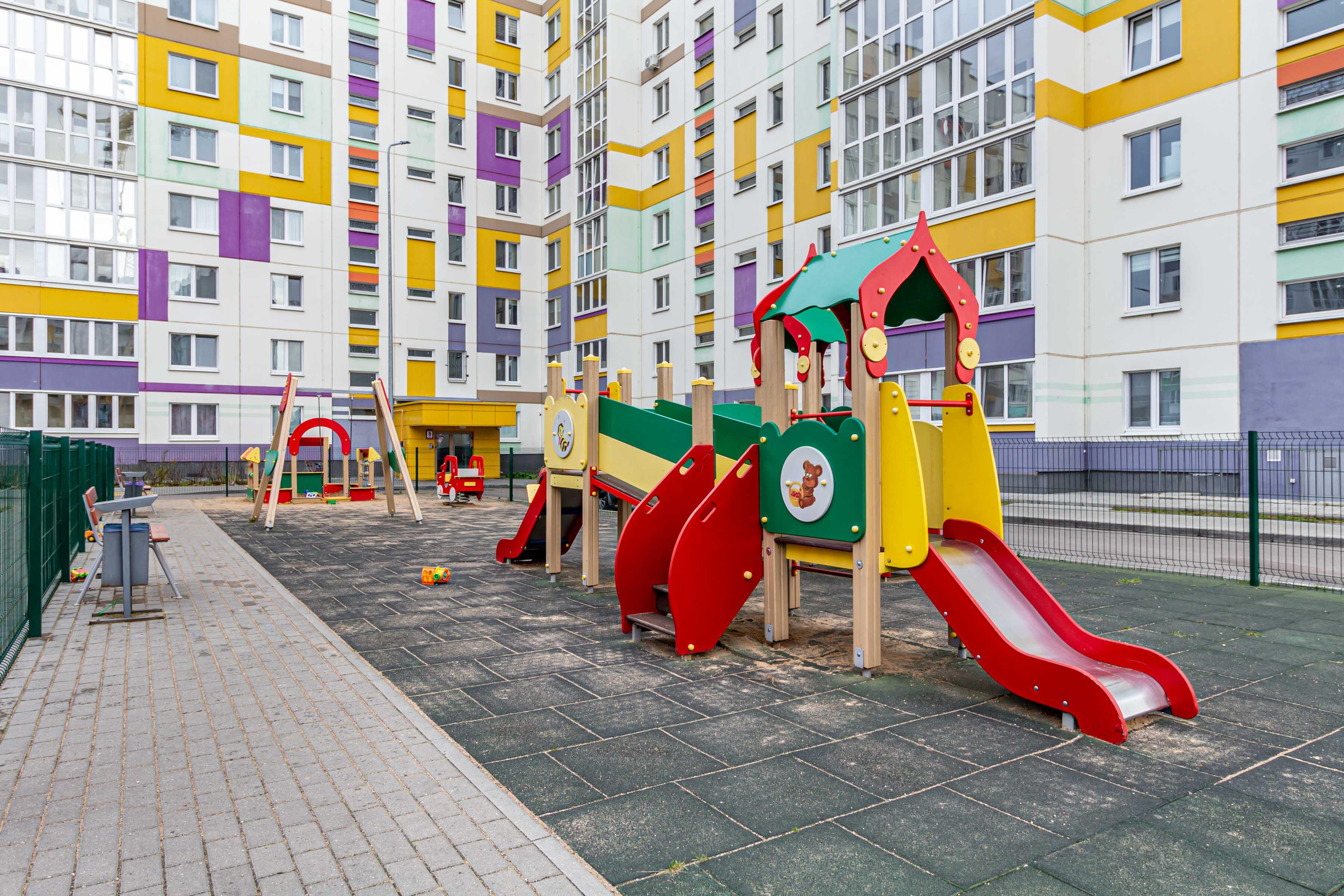 Облагороженная придомовая территория с обустроенной детской площадкой и стоянкой для автомобилей.