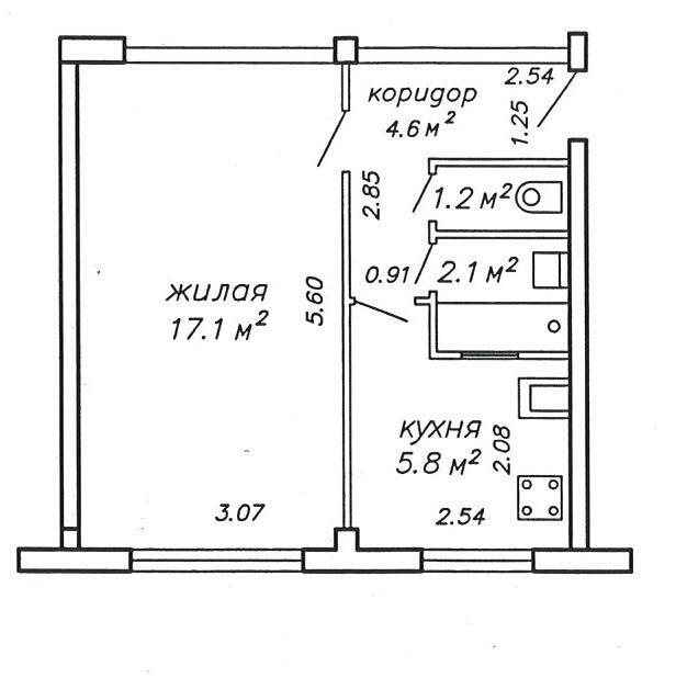 Общая площадь квартиры 30,8 кв.м по СНБ - кв. м( жилая площадь 17,1 кв.м., кухня 5,8 кв. м.) высота потолка 2, 51, входная дверь металлическая.