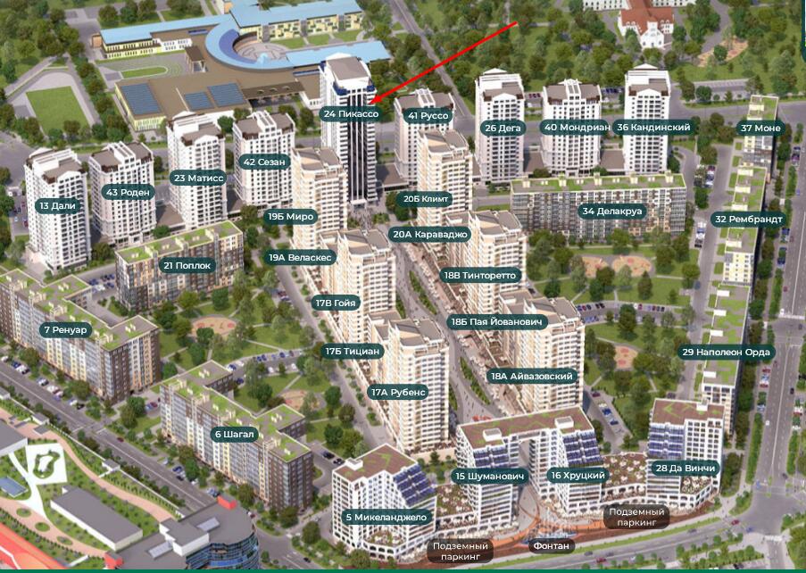 Дом 24 является САМЫМ ВЫСОКИМ в комплексе — это здание башенного типа высотой 25 этажей. Из окон здания открывается захватывающий вид не только на аллею фонтанов, но и на Национальную библиотеку и весь город!