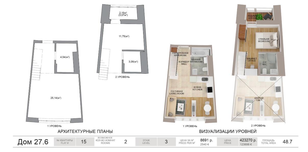 -Антресольный этаж: Каждая квартира имеет антресоль — дополнительный уровень, который идеально подходит для организации кабинета, спальни или мини-спа-зоны. Площадь антресоли не превышает 40% от площади основного помещения.
