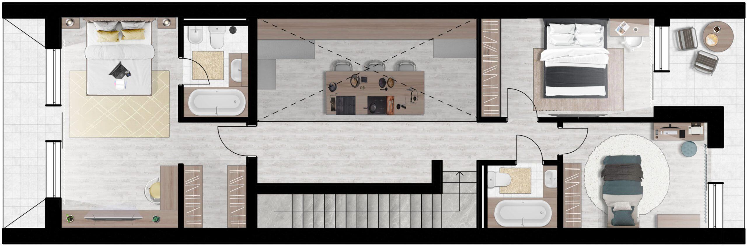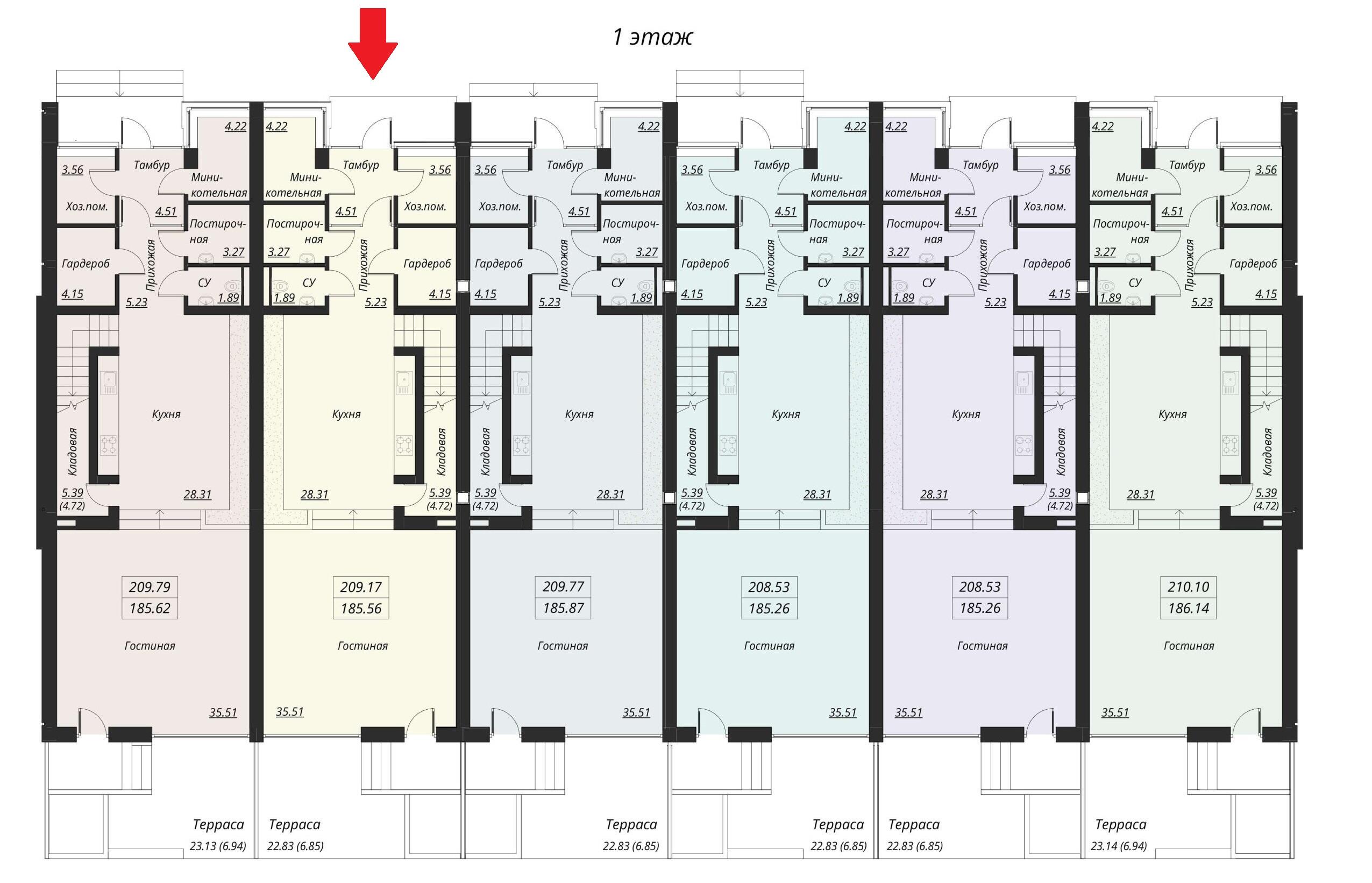 Закрытая территория с ландшафтным дизайном, идеально подходящая для отдыха на свежем воздухе. Каждый таунхаус имеет собственный участок 0,2 сотки.