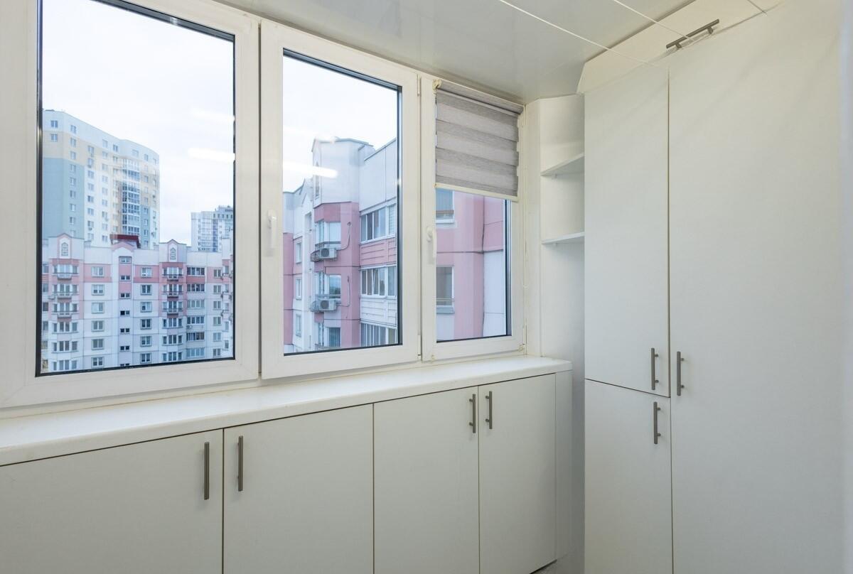 Просторная застекленная лоджия с системой хранения.