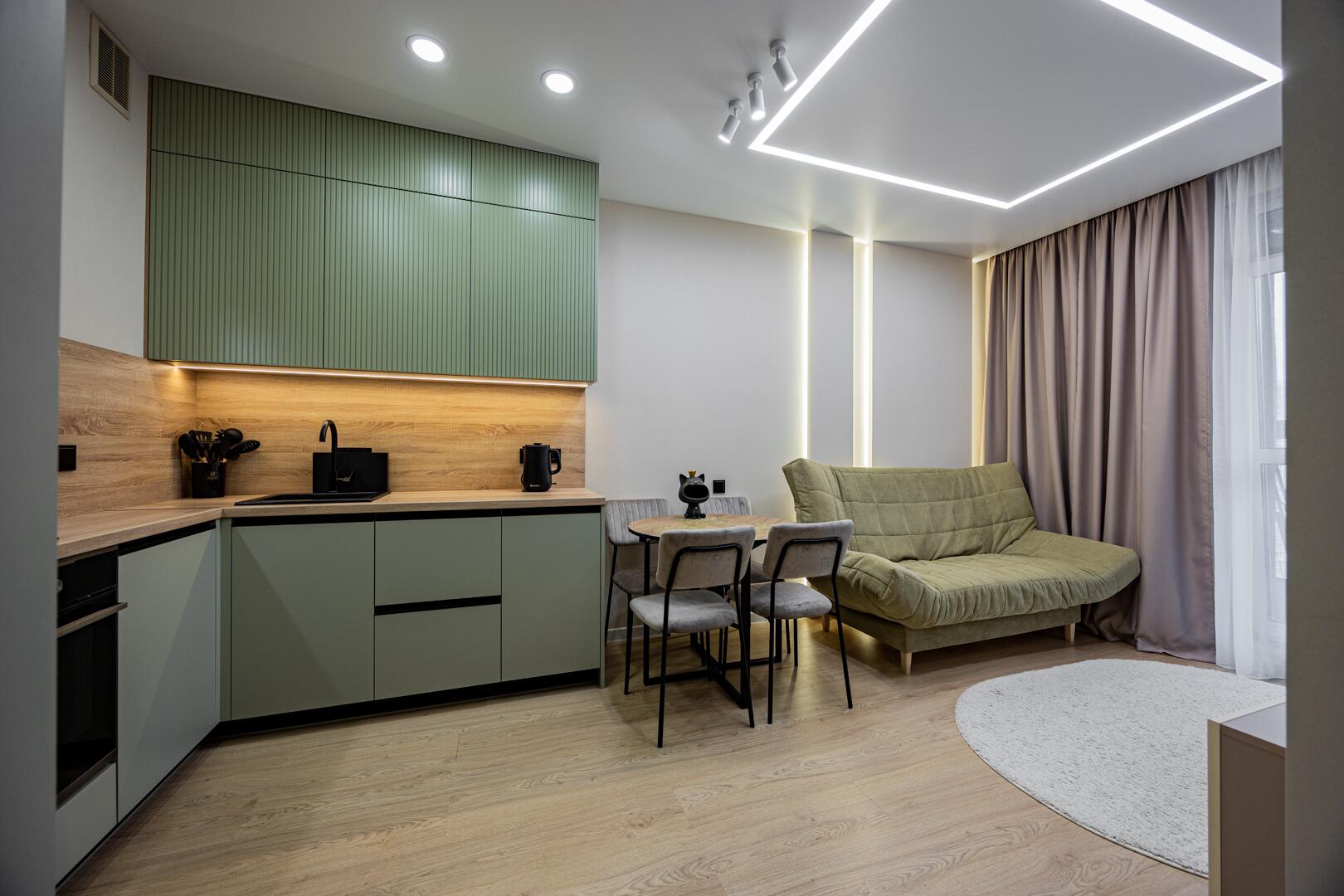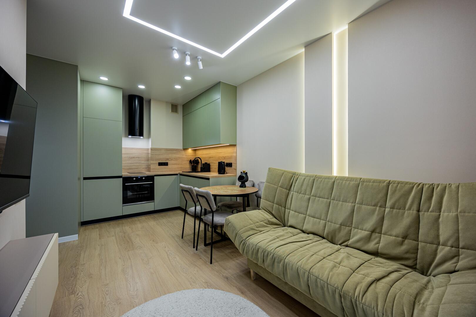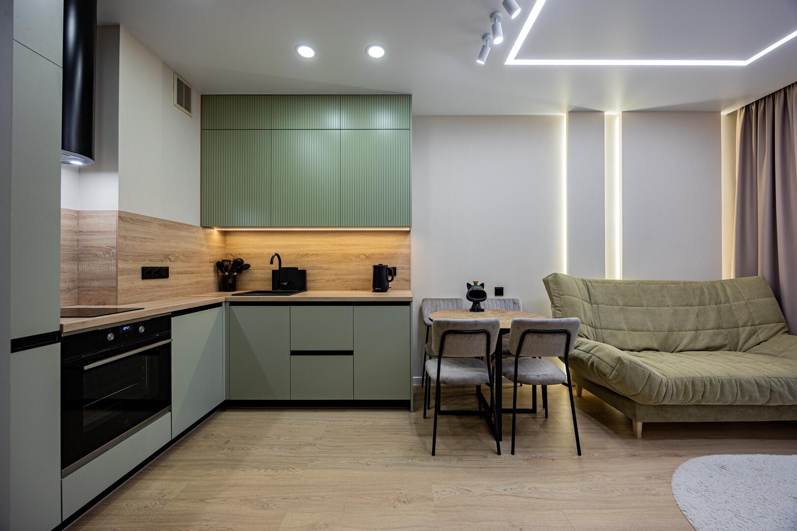 Оборудованная кухня-гостиная со встроенной мебелью и техникой.