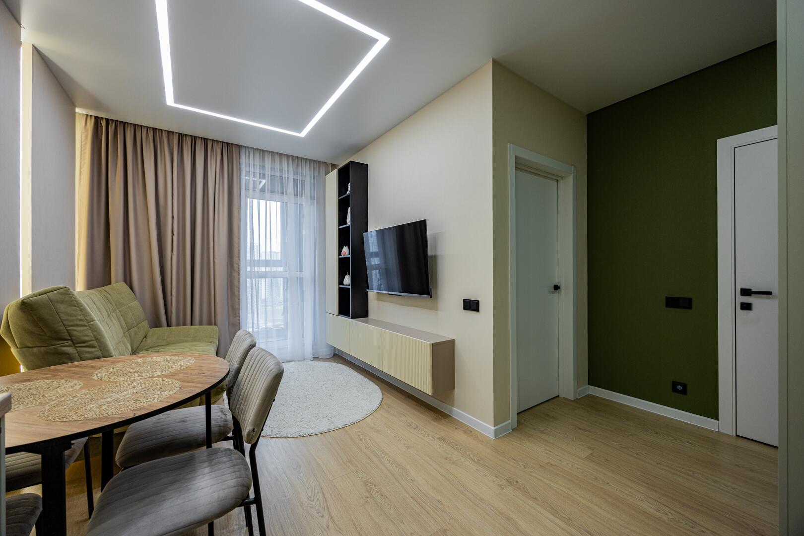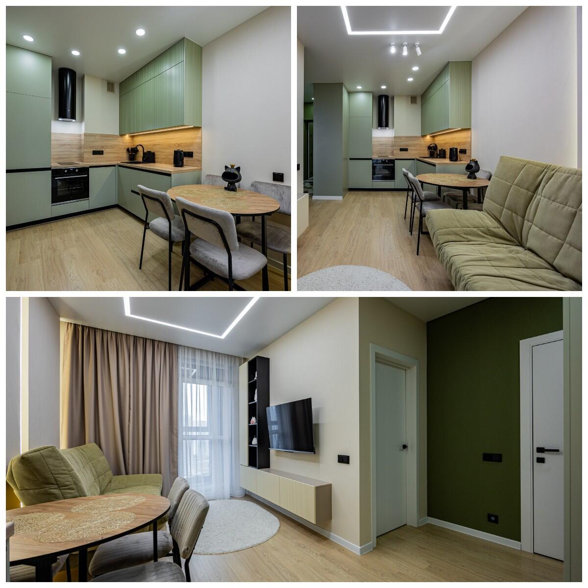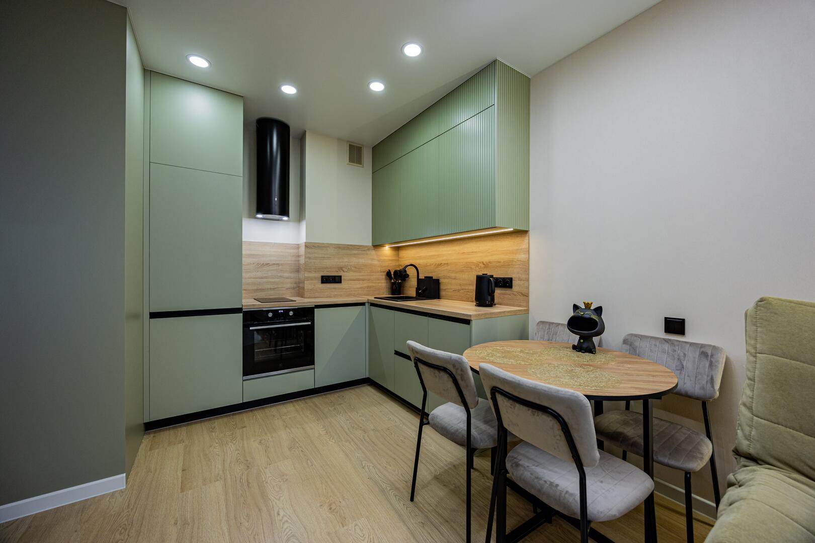Оборудованная кухня-гостиная со встроенной мебелью и техникой.